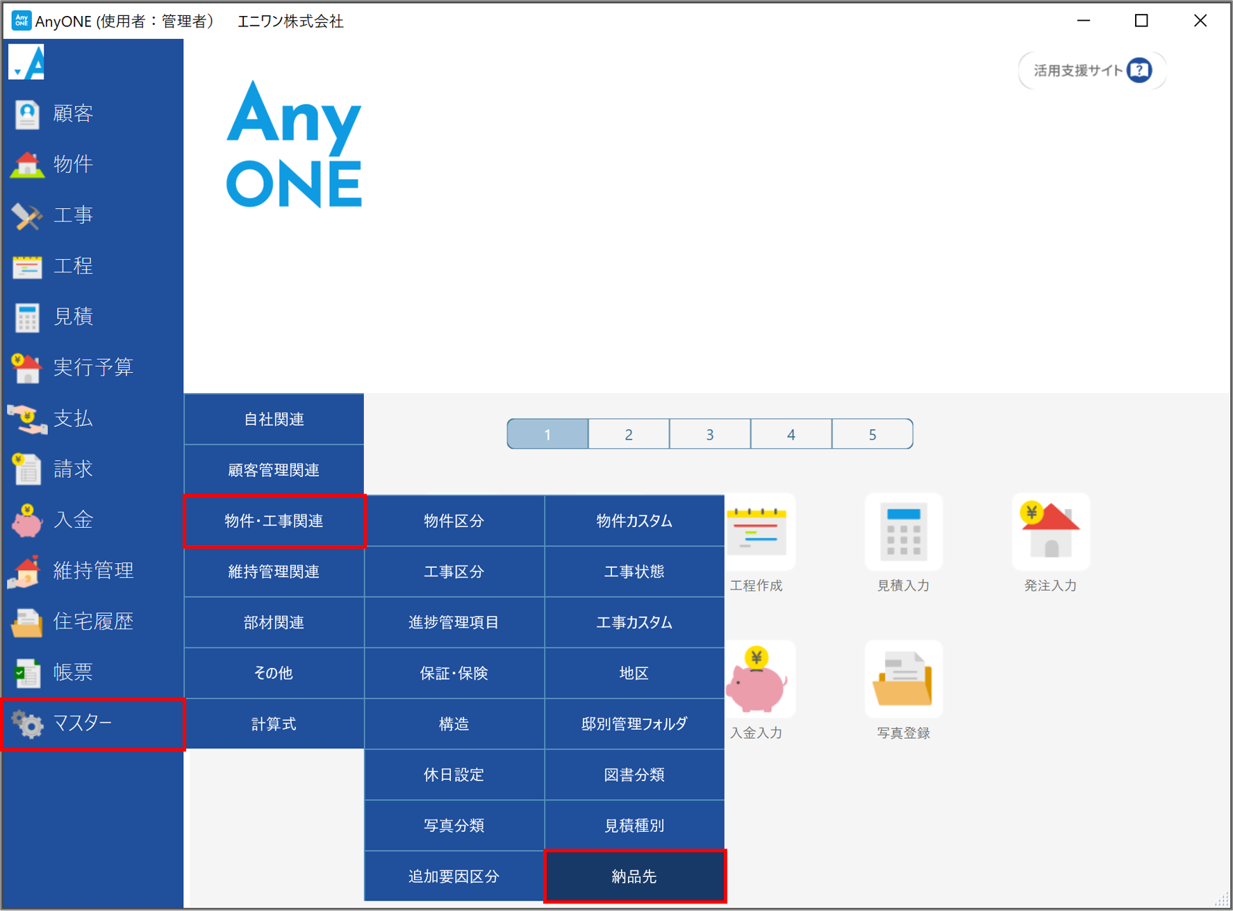 1)【マスター】>【物件・工事関連】>【納品先】をクリックします。