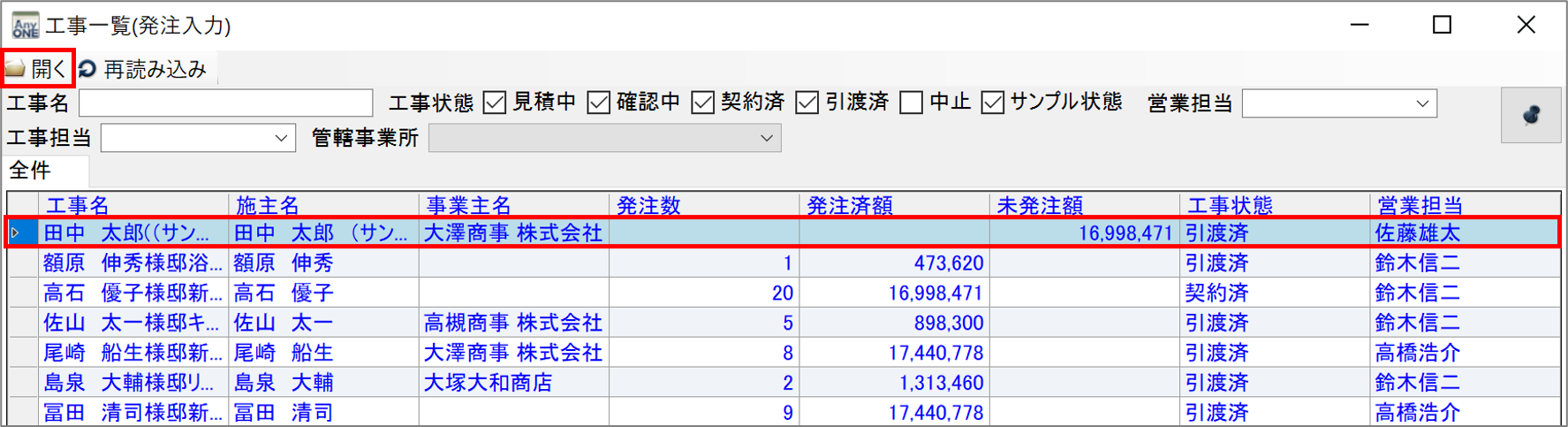 2)『工事一覧(発注入力)』画面が表示されるので発注したい工事を選択し、ツールバーの「開く」ボタンをクリックします。