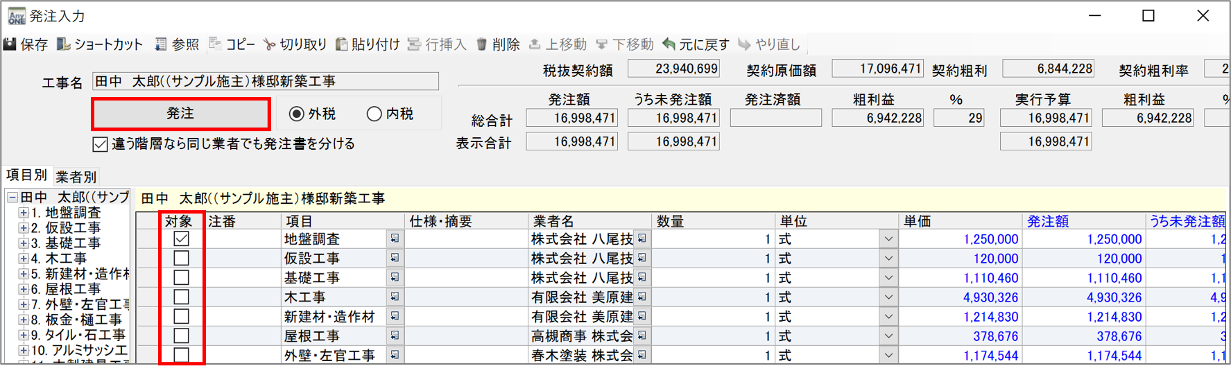 3)『発注入力』画面が表示されるので、発注したい項目の「対象」チェックボックスにチェックを入れます。次に「発注」ボタンをクリックします。