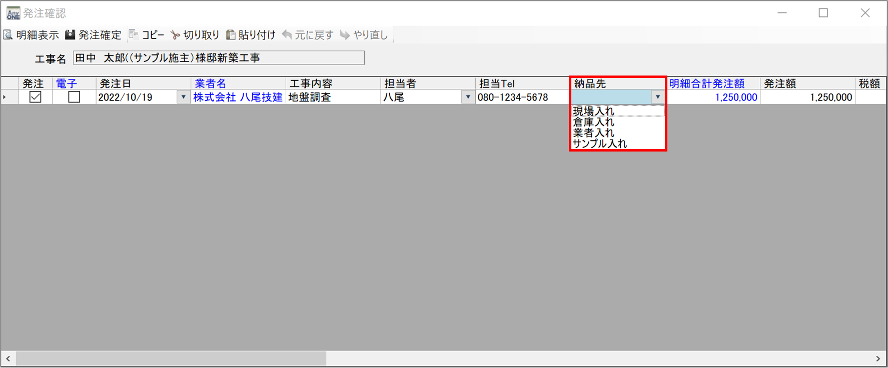 AnyONEでは発注をする際に設定できる「納品先」という項目があります。「納品先」を登録しておけば納品先が記載された発注書の出力が可能です。
