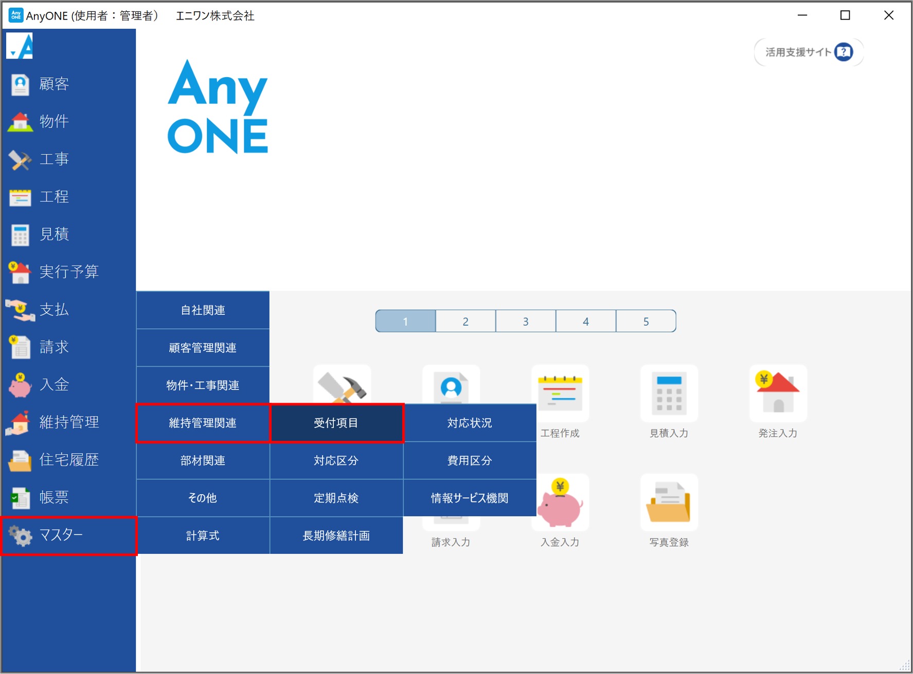 AnyONEでは維持管理入力のメンテナンス記録を登録する際に設定できる「受付項目」という項目があります。「受付項目」を登録しておけば『維持管理検索』画面での検索条件に利用が可能です。