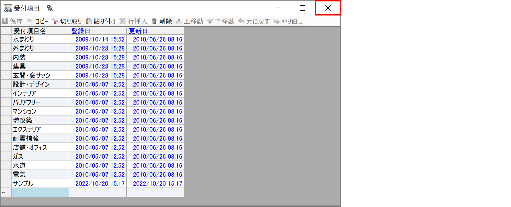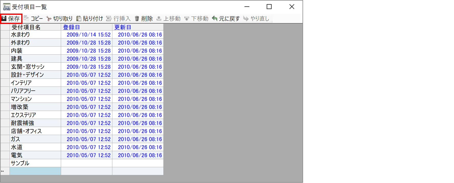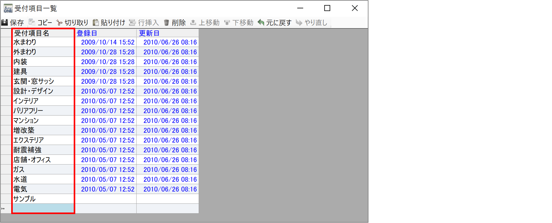 2)『受付項目一覧』画面が表示されるので「受付項目」に登録したい受付項目名を編集・入力します。