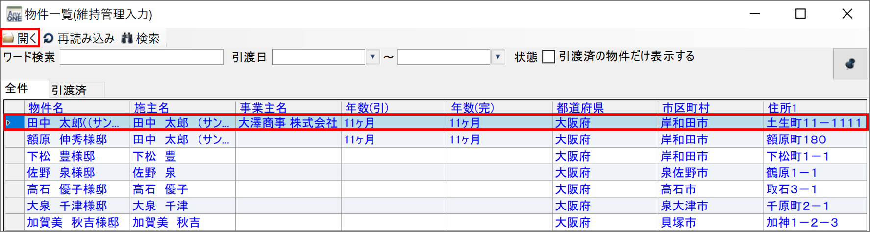 2)『物件一覧(維持管理入力)』画面が表示されるので「受付項目」を登録したい物件名を選択し、ツールバーの「開く」ボタンをクリックします。
