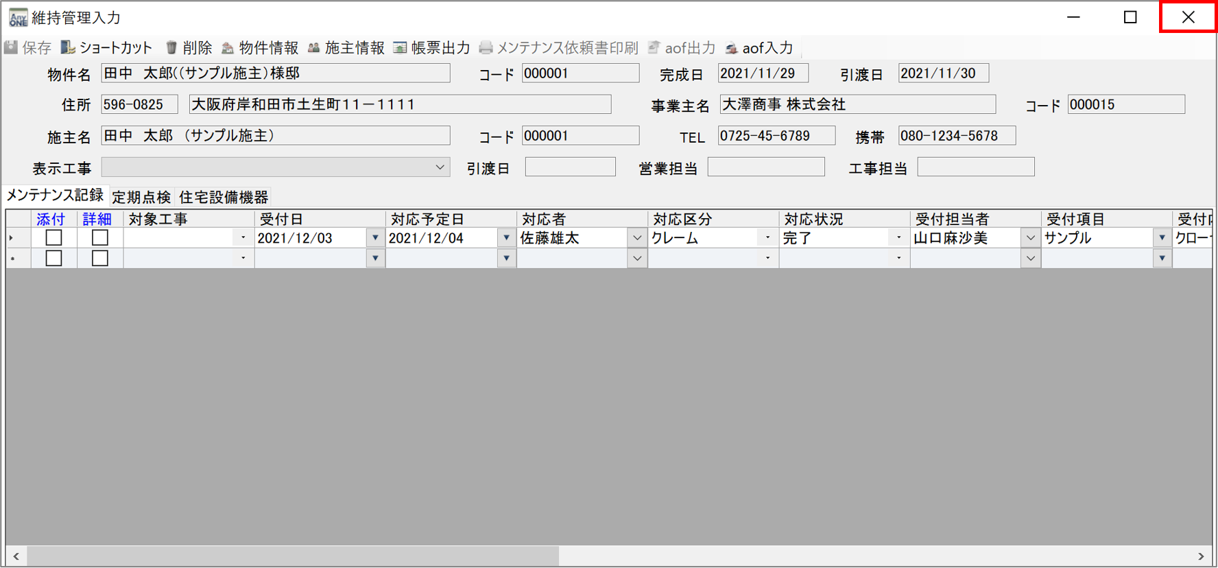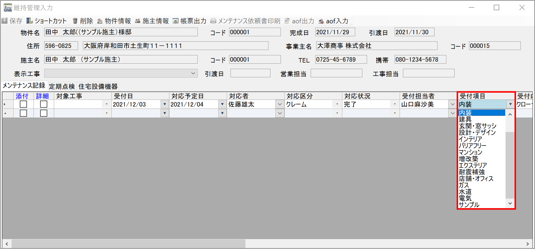3)『維持管理入力』画面が表示されるので「メンテナンス記録」タブの「受付項目」のプルダウンを開きます。登録した「受付項目名」が表示されていれば登録完了です。