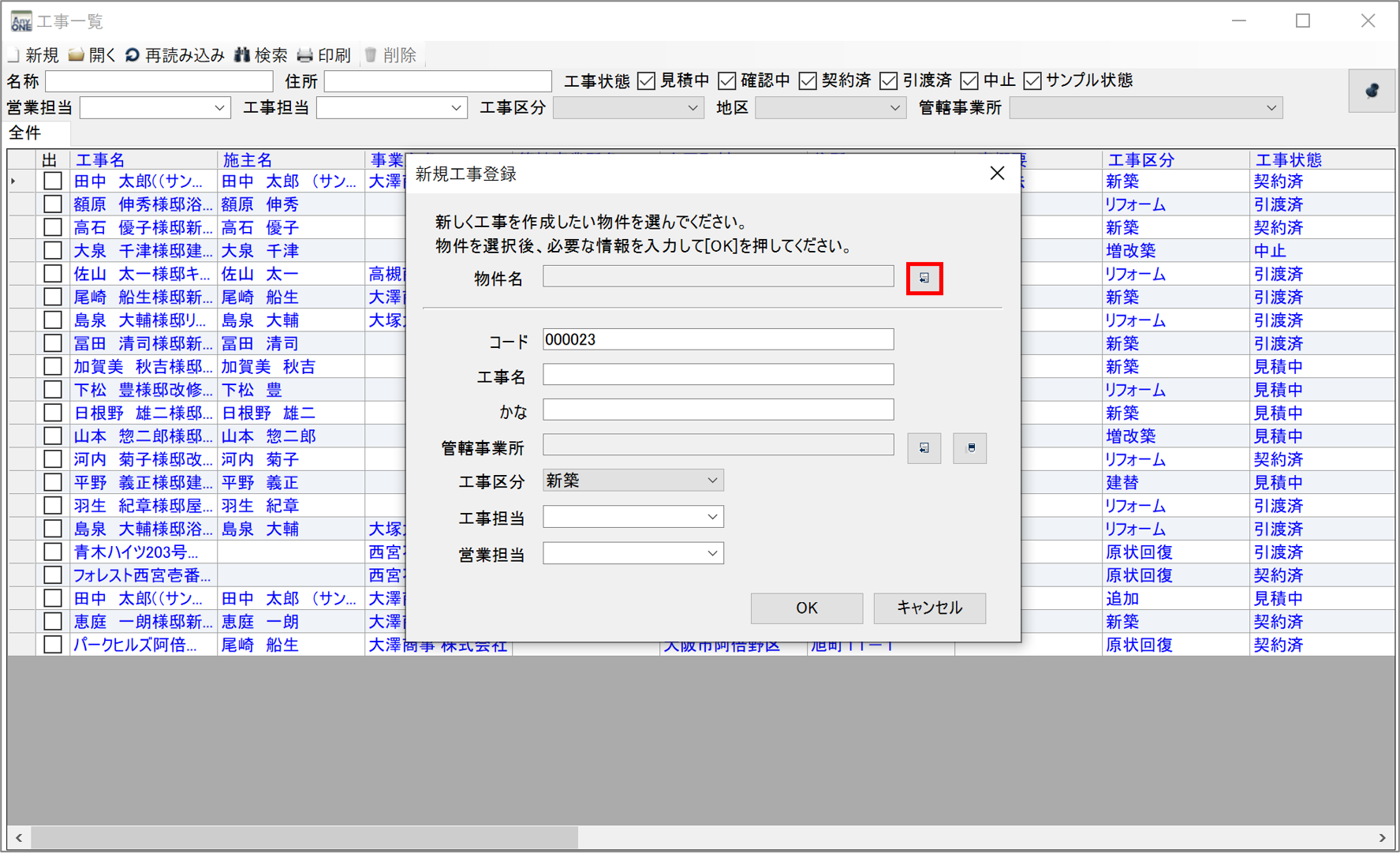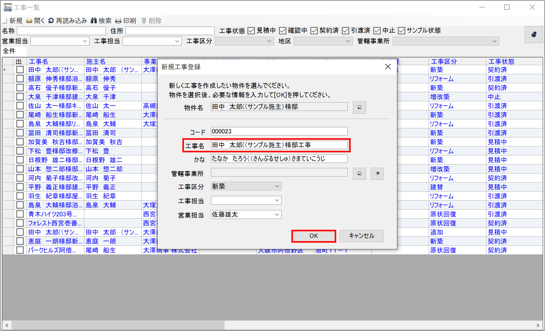 5)選択した物件が設定され、物件名から工事名等が自動で設定されます。その他必要な情報を入力して「OK」ボタンをクリックします。