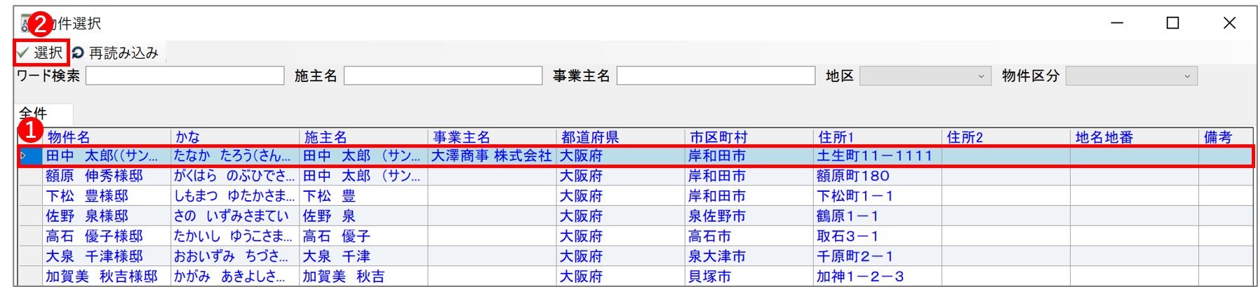 4)『物件選択』画面が表示されるので、工事を作成したい物件を選択❶し、ツールバーの「選択」❷をクリックします。(もしくは選択したい物件のセルをダブルクリックします)