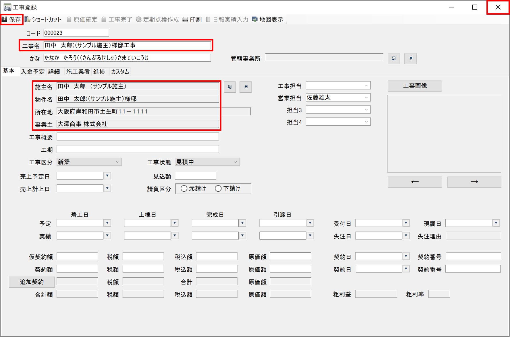 ここに工事の情報を入力していきます。「工事名」は必須入力項目になっています。その他の情報を入力して、ツールバーの「保存」ボタンをクリックします。閉じる場合は、右上の「×」をクリックします。