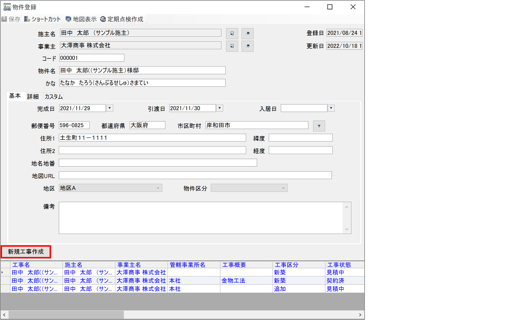 1)これまでに説明した工事登録の方法以外に、物件登録の流れから直接工事を作成する方法があります。まず、通常の流れで物件を作成して保存します。次に『物件登録』画面の左下にある「新規工事作成」ボタンをクリックします。