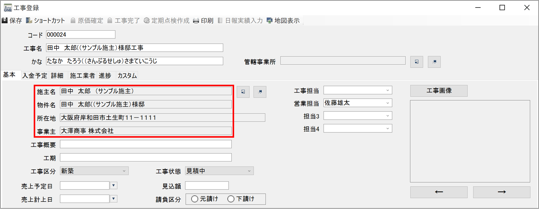 6)『工事登録』画面が表示されるので、「物件名」に選択した物件が表示されていることを確認します。さらに物件に「施主」「所在地(住所)」「事業主」が入力されていれば、各項目も表示されます。