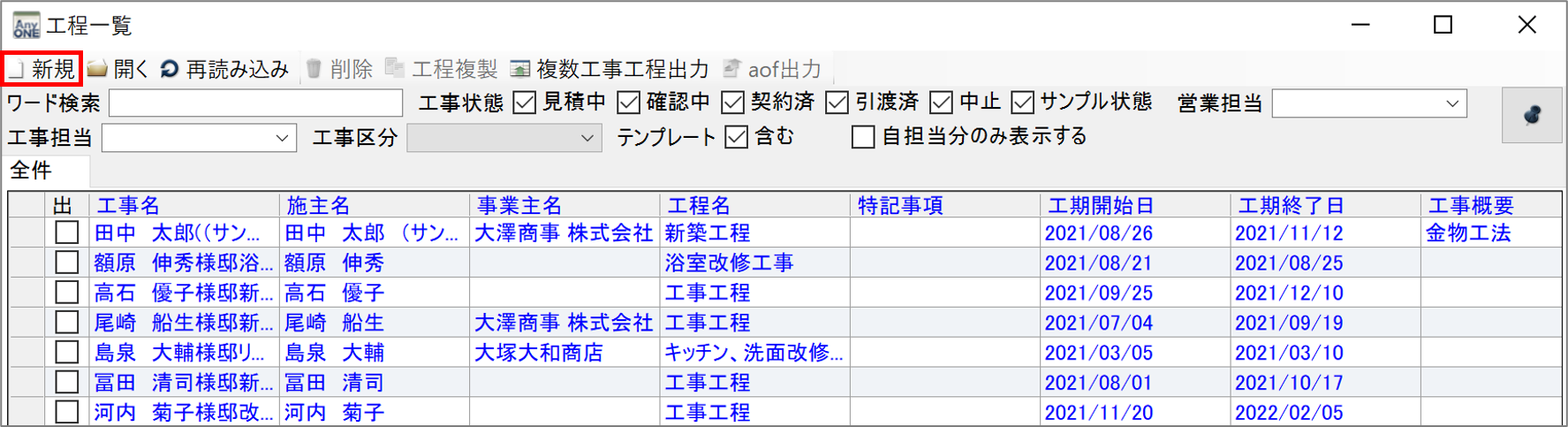 2)『工程一覧』画面が表示されます。ここには、登録済の工程表が一覧で表示されます。新しく工程表を作成するために、ツールバーの「新規」ボタンをクリックします。