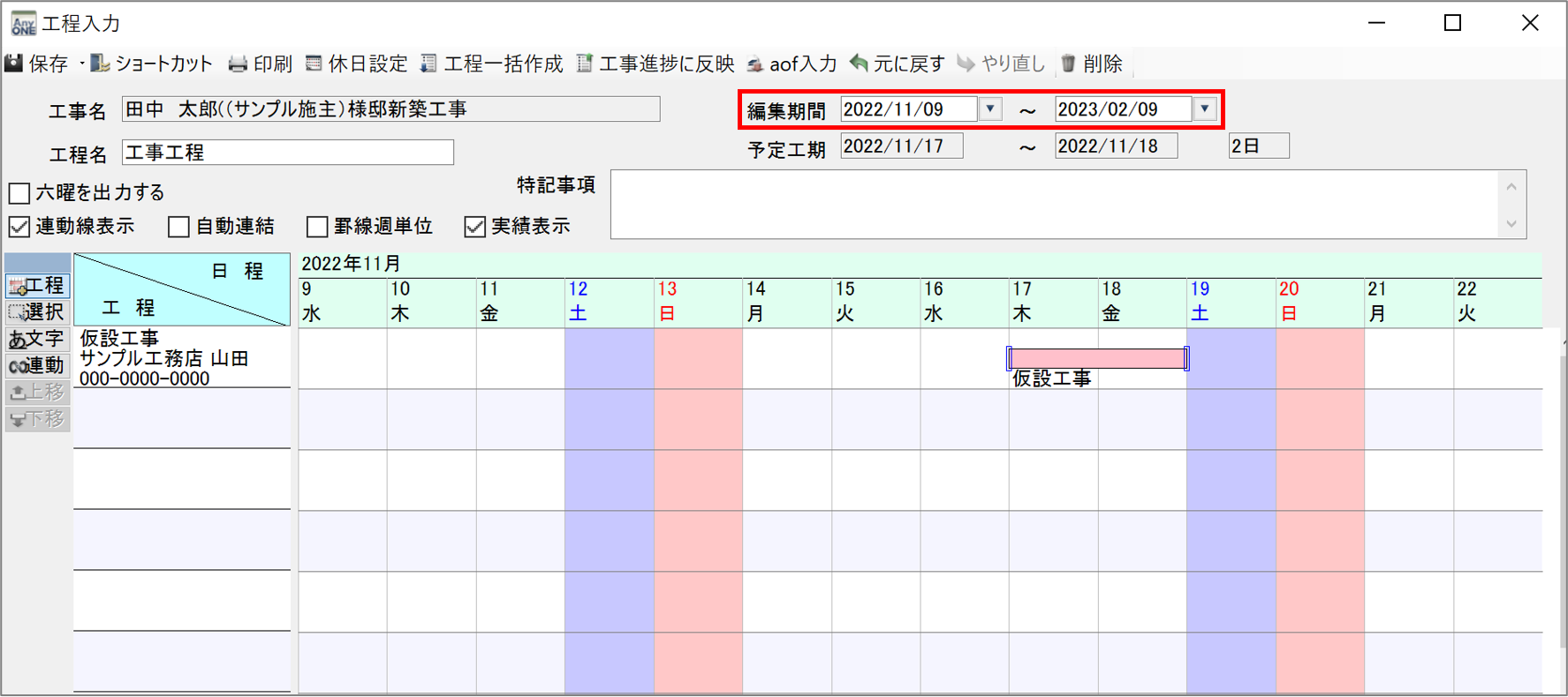 工程表はこちらで作成をおこないます。一般的なバーチャートの工程表が作成でき、日程の移動なども簡単におこなえます。作成した工程表は、印刷の他にエクセルで出力することも可能です。
