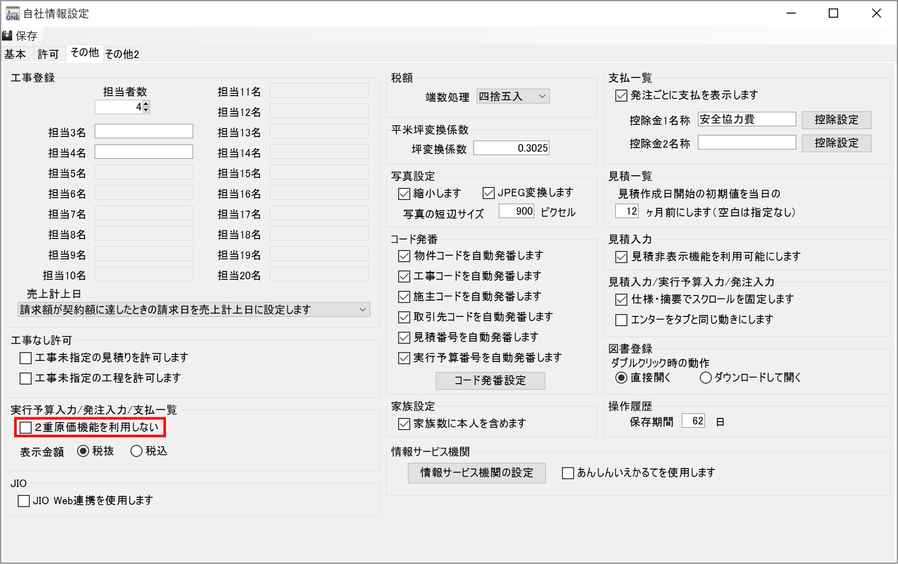 3)「実行予算入力/発注入力/支払一覧」の「2重原価機能を利用しない」のチェックボックスで設定します。