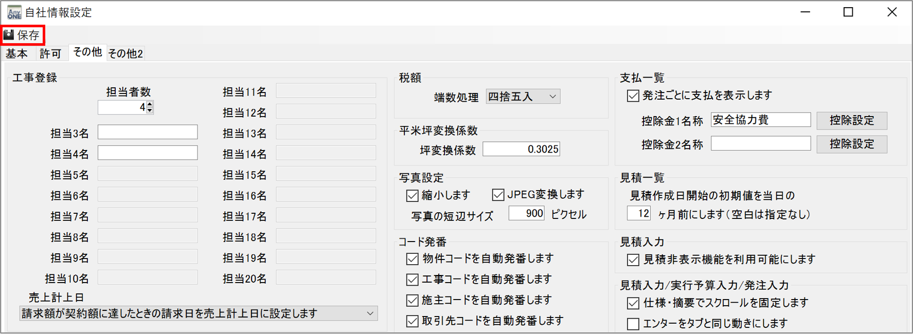 2)『自社情報設定』画面が表示されるので「その他」タブをクリックします。