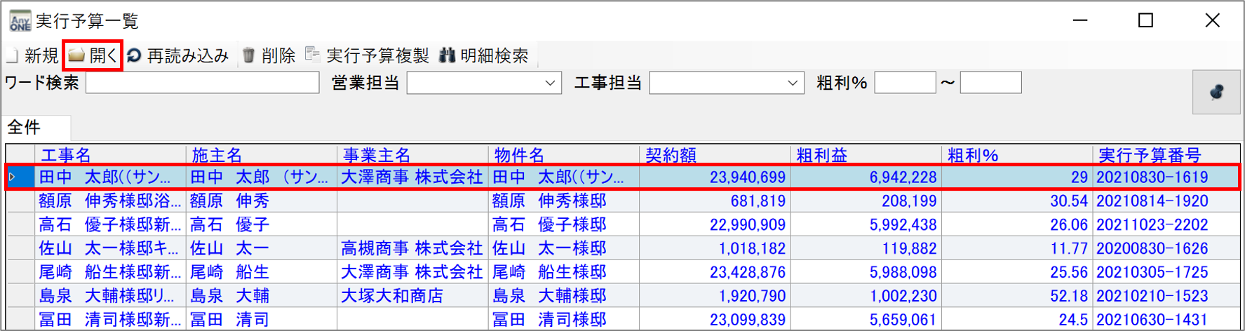 2)『実行予算一覧』画面が表示されるので、該当する工事を選択しツールバーの「開く」ボタンをクリックします。