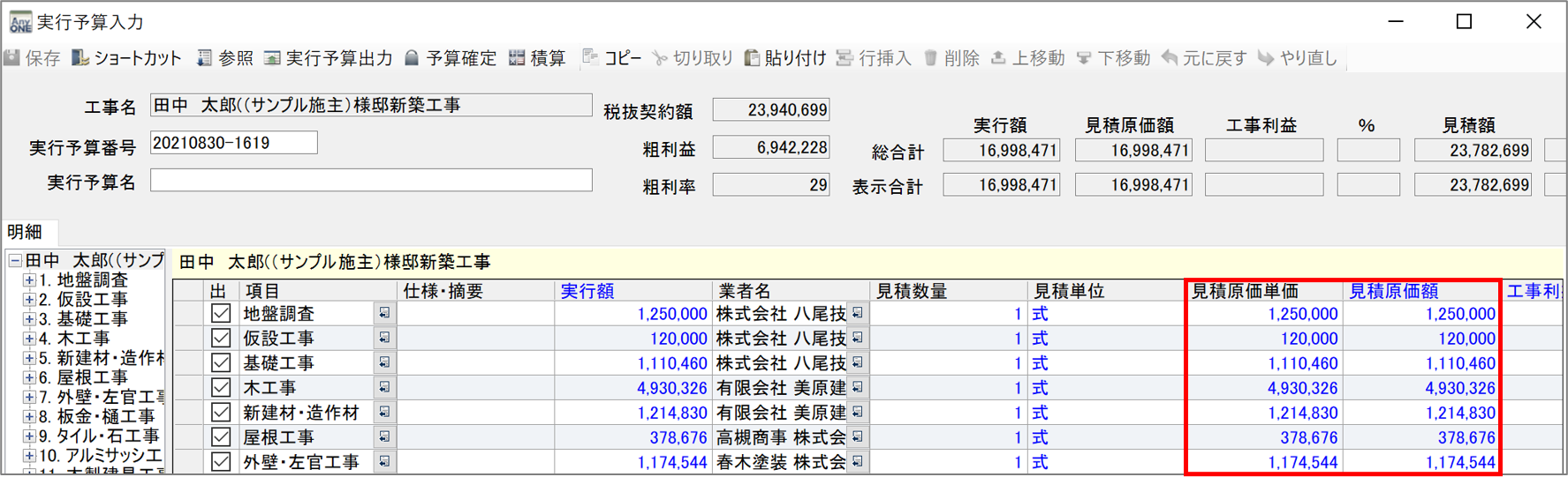 3)『実行予算入力』画面が表示されるので「見積原価単価」と「見積原価額」の項目が表示されていれば設定完了です。