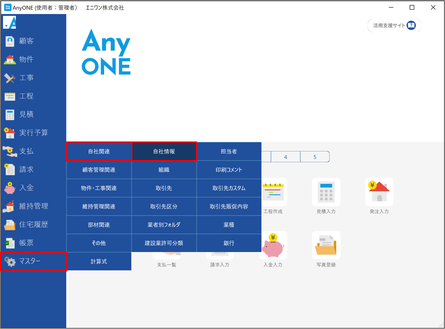 1)【マスター】>【自社関連】>【自社情報】をクリックします。