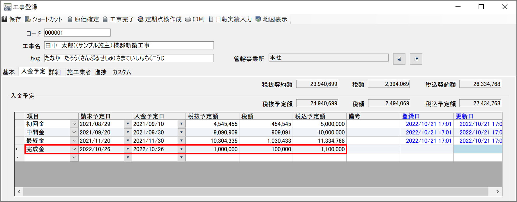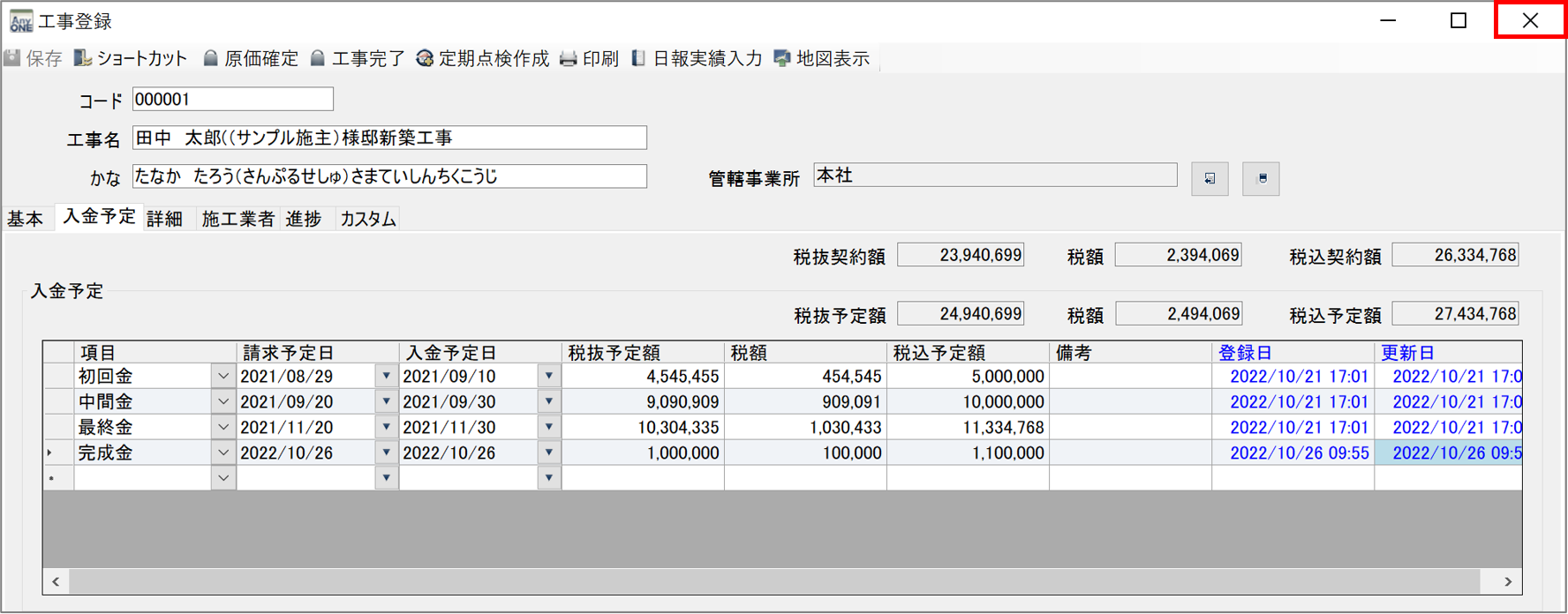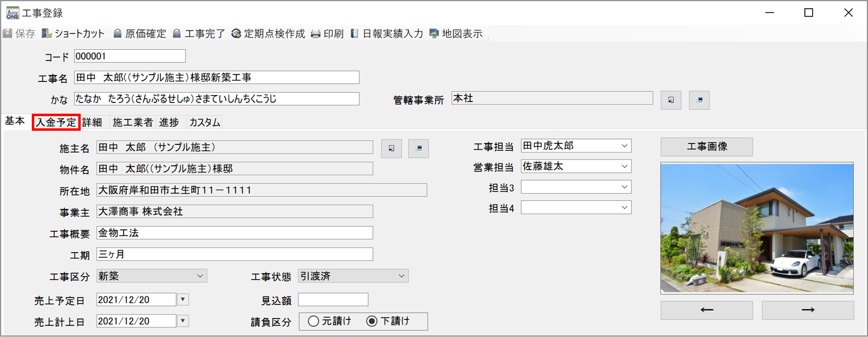 3)『工事登録』画面が表示されるので、「入金予定」タブをクリックします。