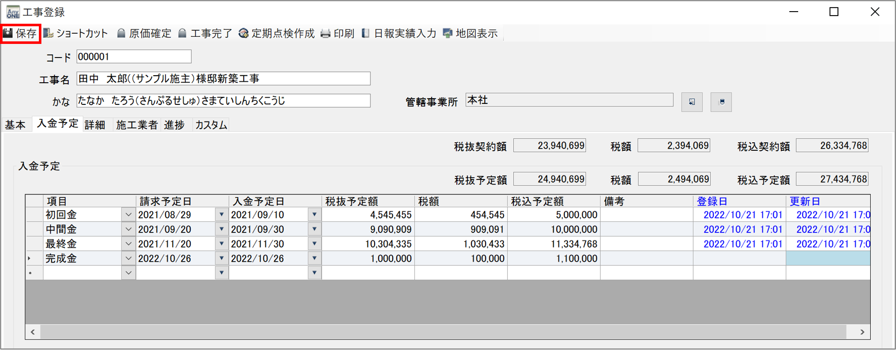 AnyONEの初期設定では『工事登録』画面の「入金予定」を登録する場合、「契約額」と「入金予定額」が一致しないと保存できません。しかしこちらの設定を解除すると、「契約額」と「入金予定額」が一致しなくても保存できるようになります。「入金予定」を立てる際に、「契約額」と一致しなくては保存できない、という制限があると運用しずらい場合などは設定を解除してください。