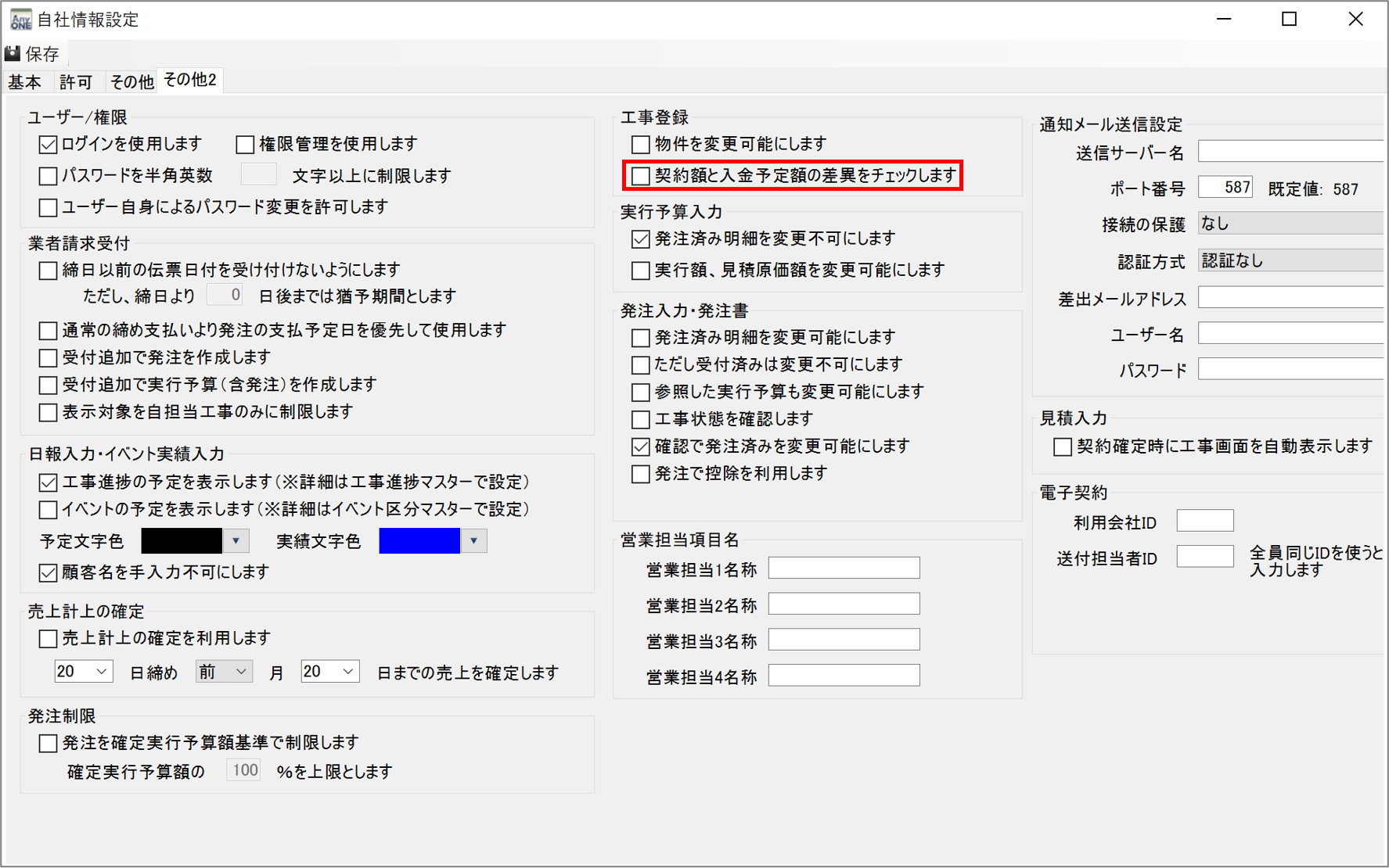 5)「工事登録」の「契約額と入金予定額の差異をチェックします」のチェックボックスで設定します。