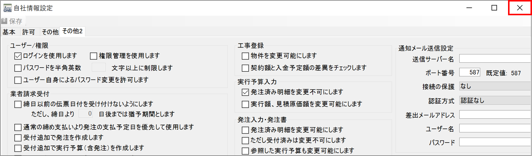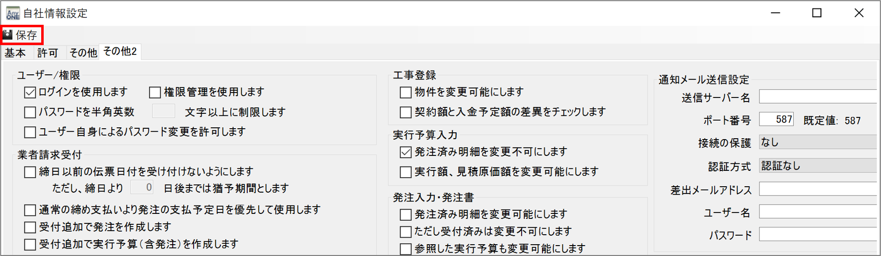 2)『自社情報設定』画面が表示されるので、「その他2」タブをクリックします。