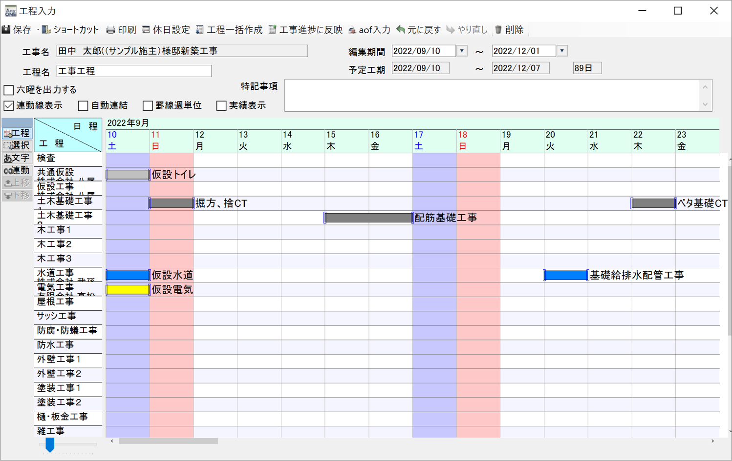 1)『工程入力』画面を開き、基準にする工程(下図の場合は上棟式)を選択し、右クリックの「一括移動」を選択します。
