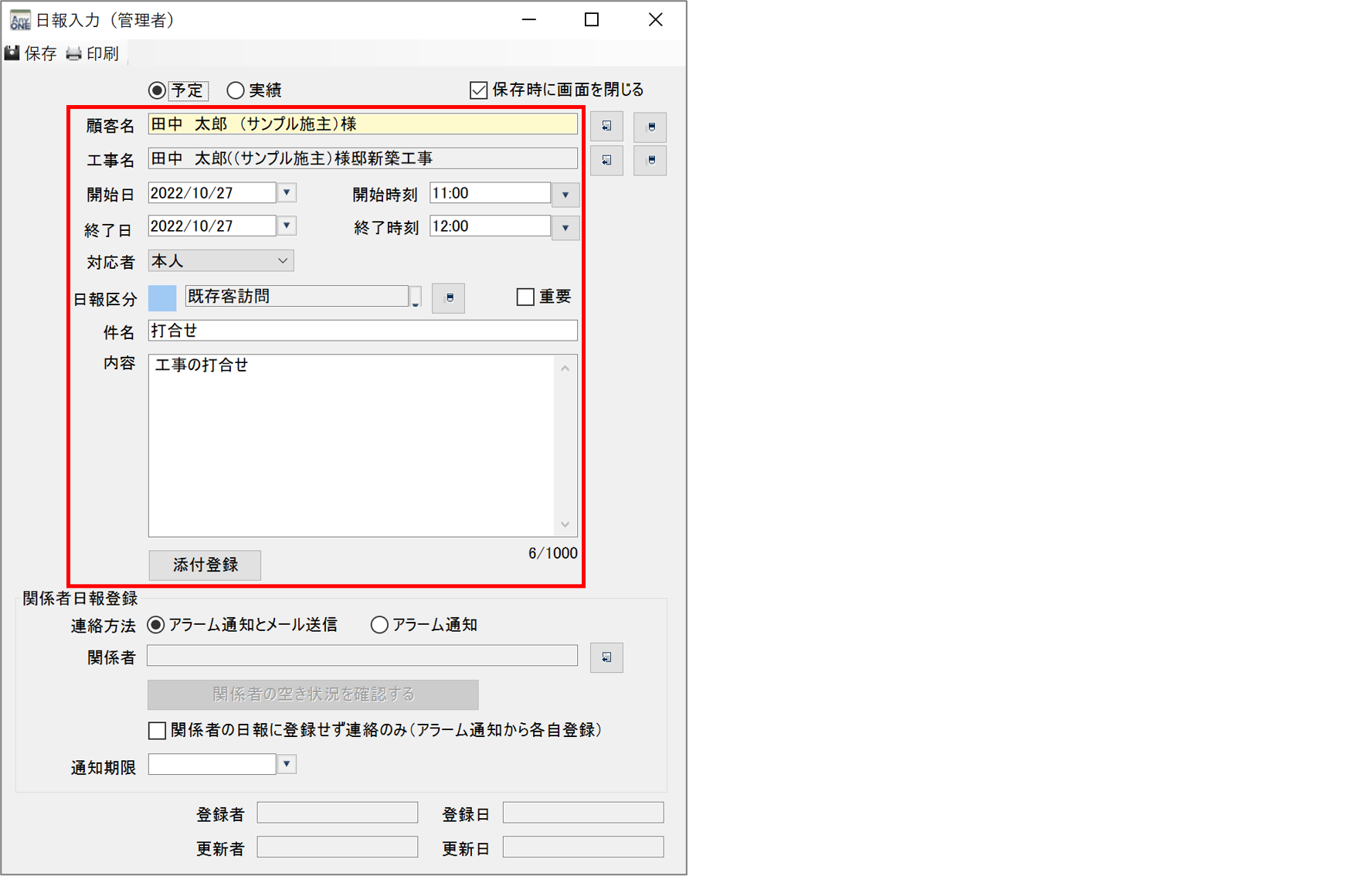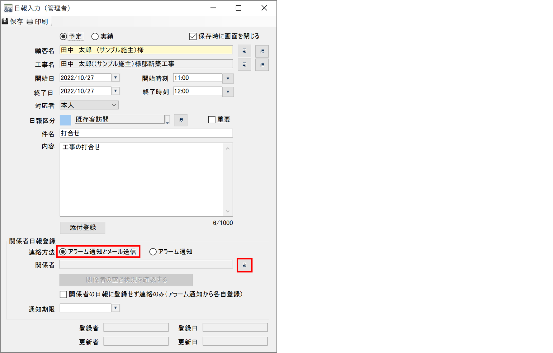 4)『日報入力(管理者)』画面の「関係者日報登録」で「アラーム通知とメール送信」にチェックを入れて、「関係者」の選択ボタンをクリックします。