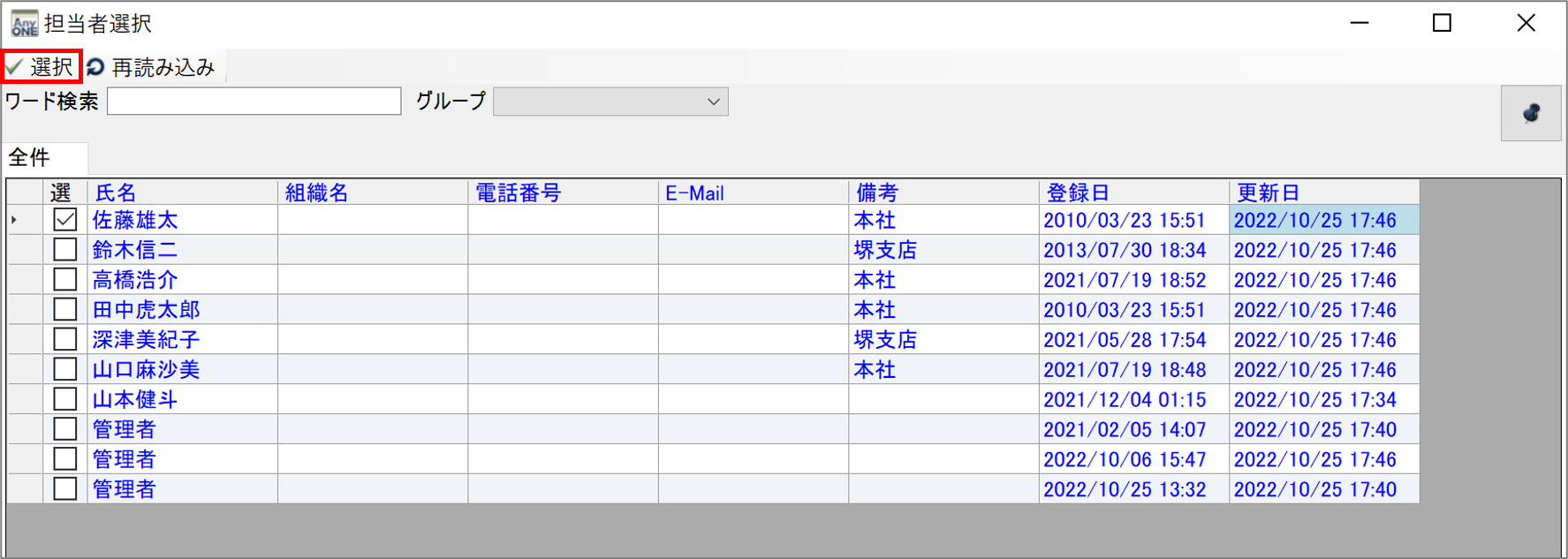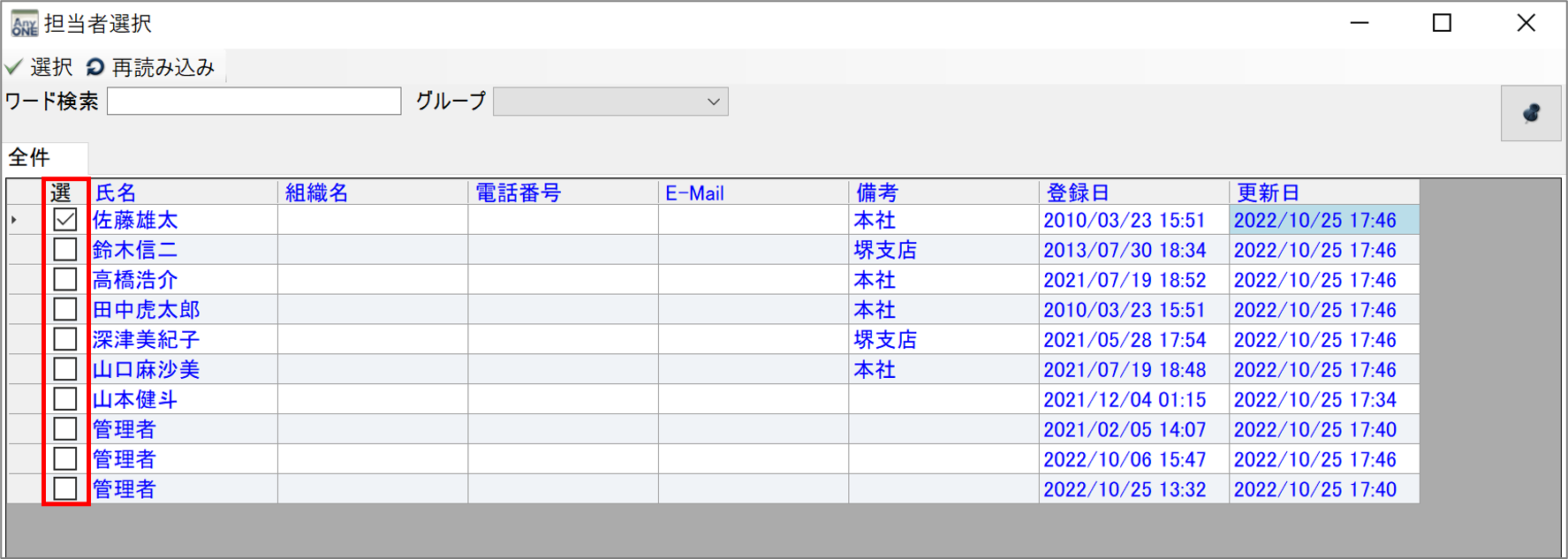 5)『担当者選択』画面が表示されるので、メール送信したい担当者の「選」にチェックを入れます。