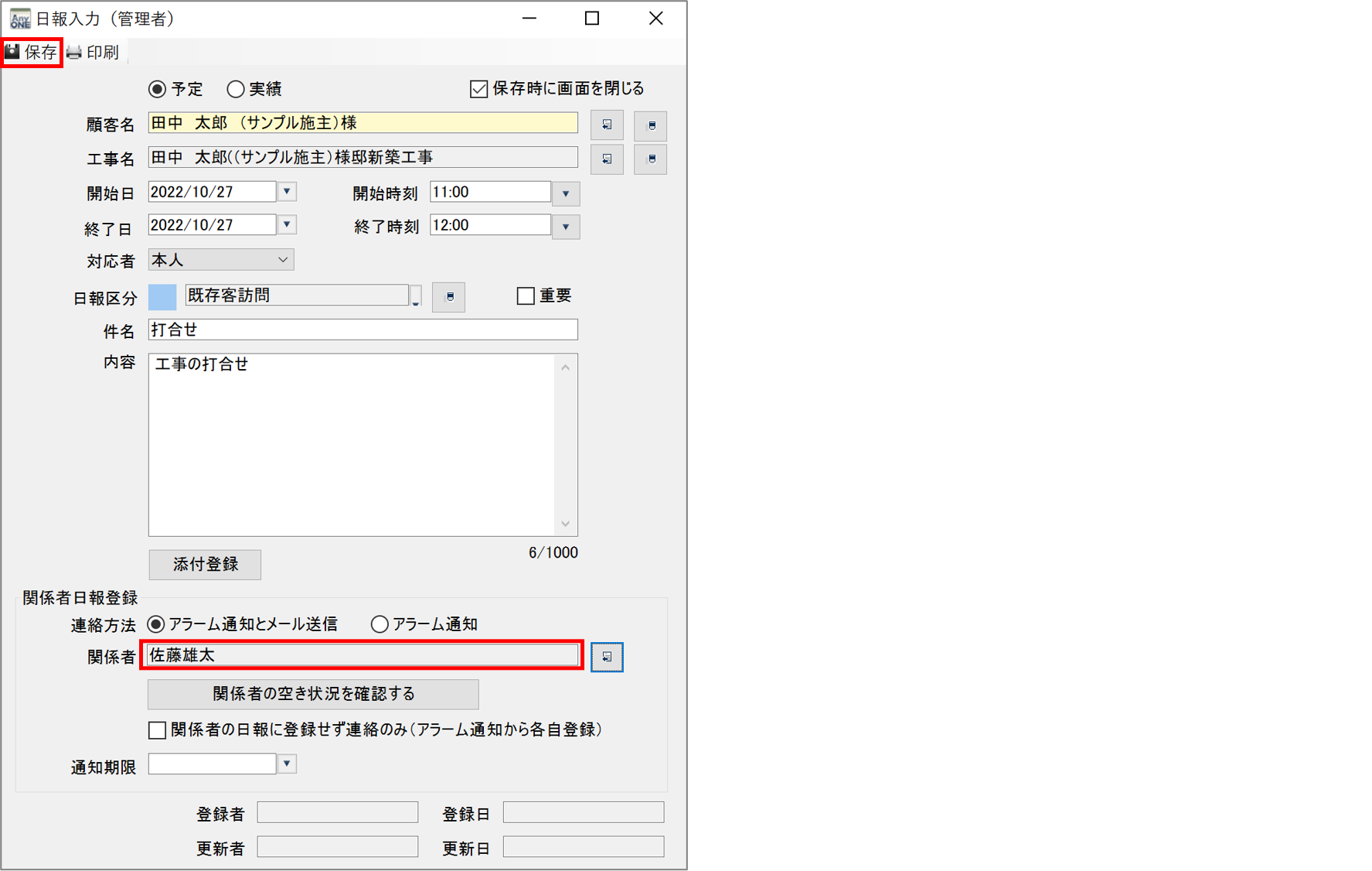 7)選択した担当者が反映されていることを確認して日報の内容に問題がなければ、ツールバーの「保存」ボタンをクリックします。