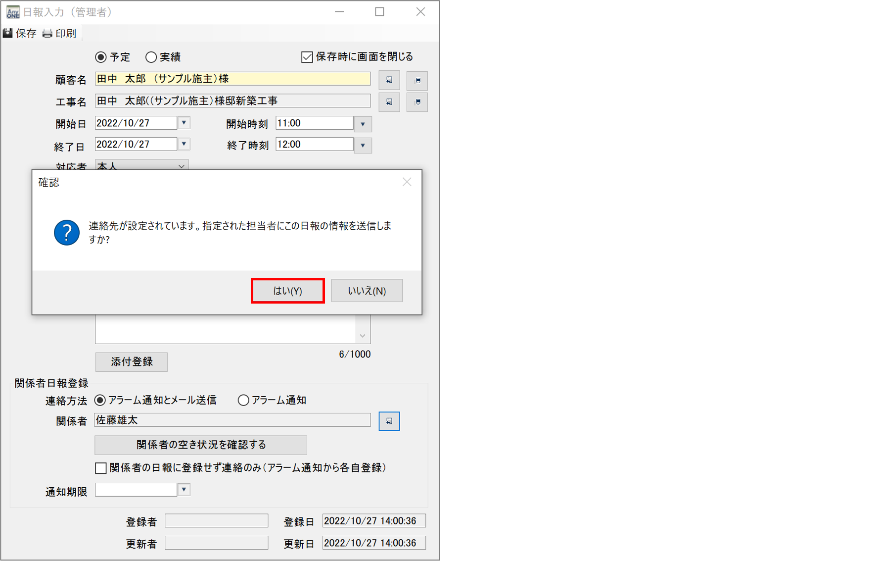 8)「連絡先が設定されています。指定された担当者にこの日報の情報を送信しますか?」画面が表示されるので、「はい」をクリックします。