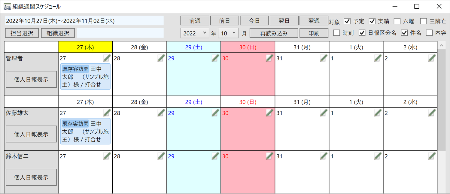 9)『日報入力(担当者名)』画面が閉じて『週間組織スケジュール』画面に戻ります。
