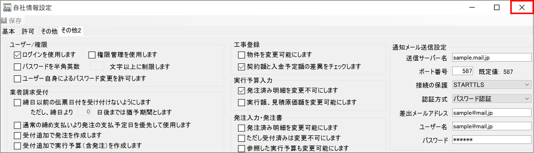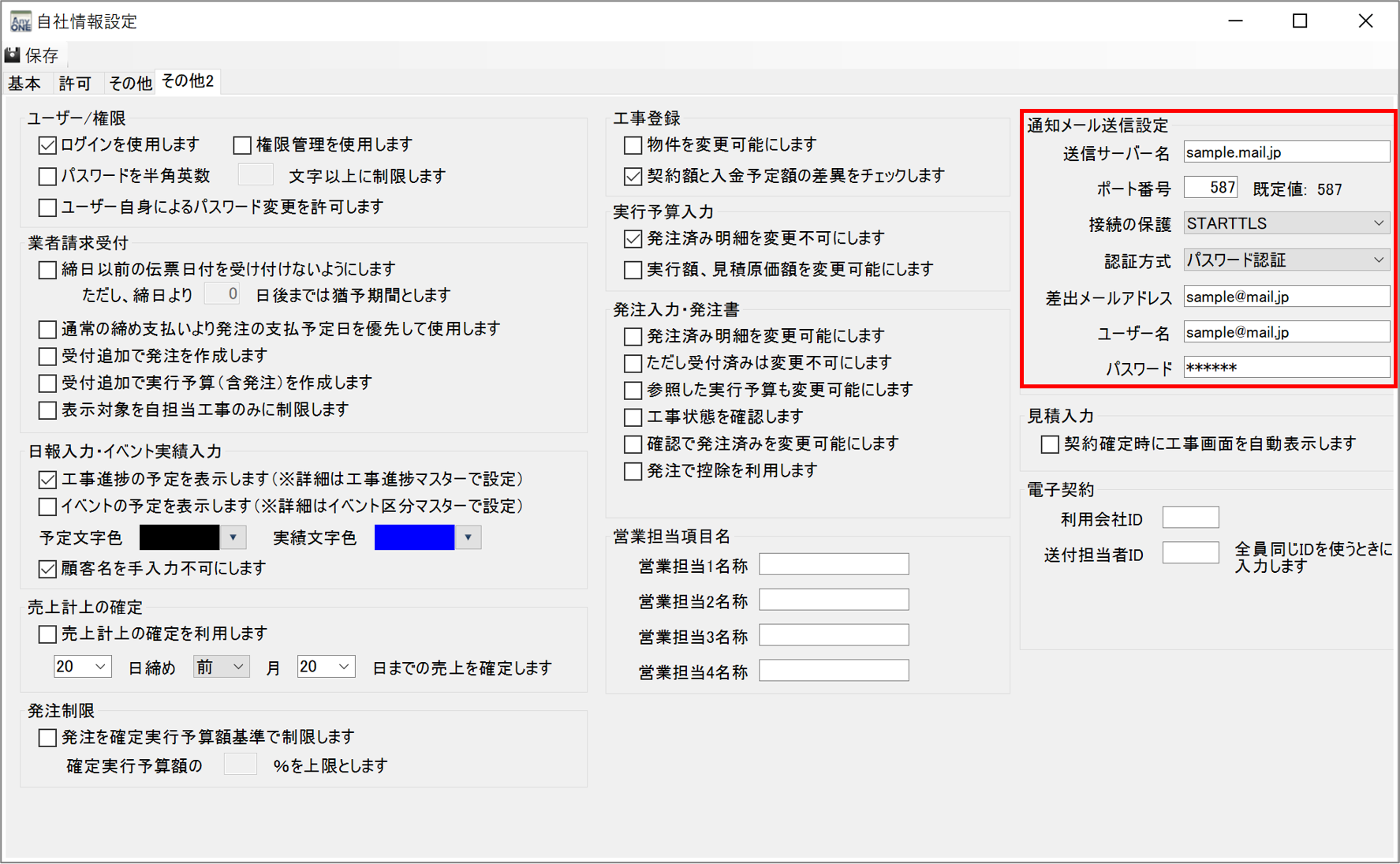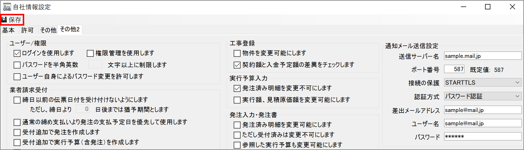 5)「発注入力・発注書」の「通知メール送信設定」に必要な項目を入力します。