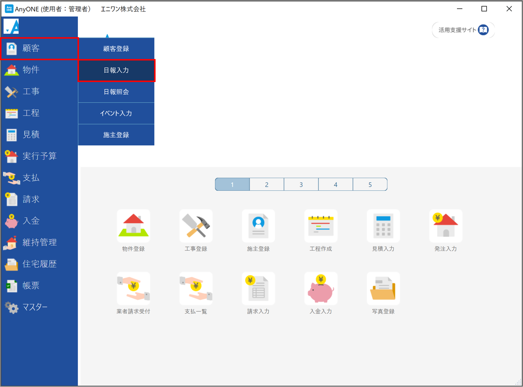 1)【顧客】>【日報入力】をクリックします。