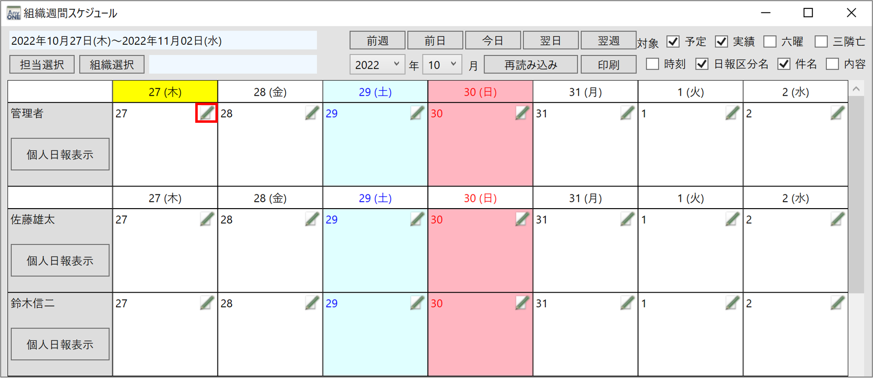 2)『週間組織スケジュール』画面が表示されるので、日付の右上にある「鉛筆と紙」ボタンをクリックします。