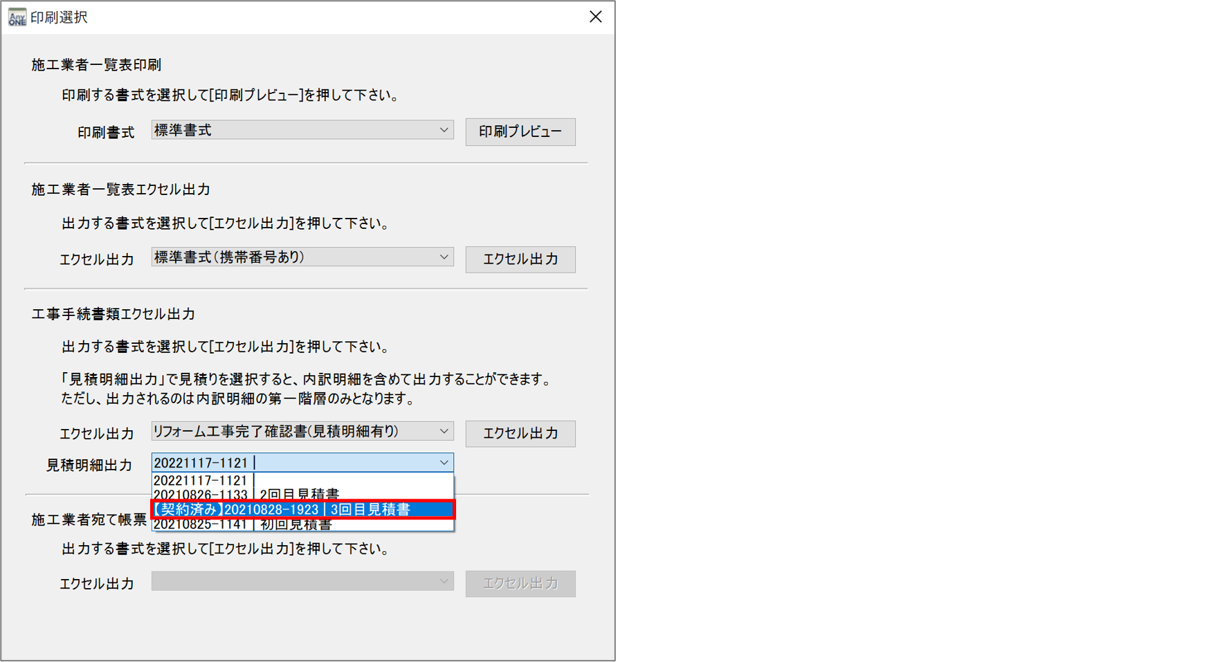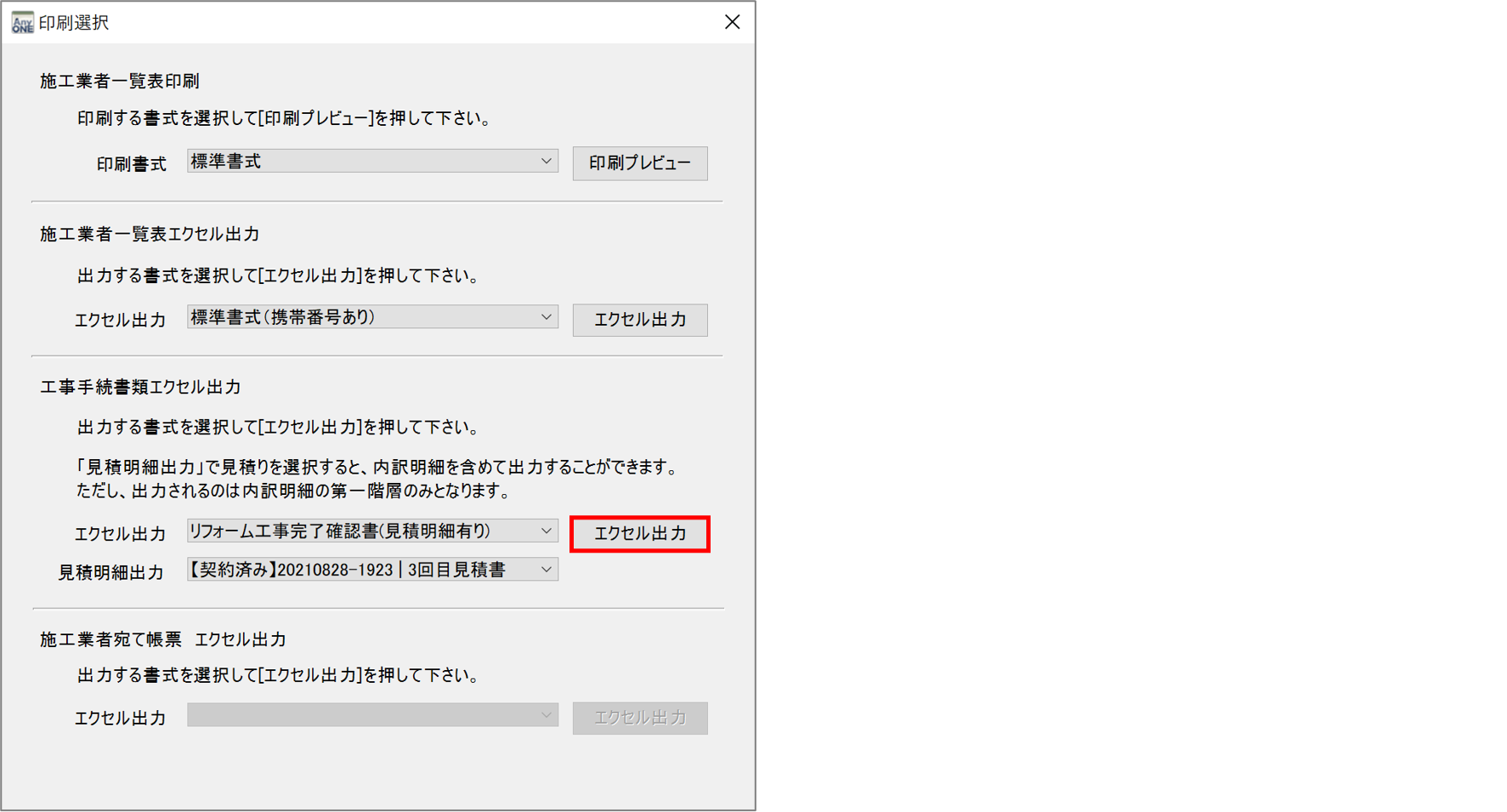 4)『印刷選択』画面が表示されるので、「工事手続書類エクセル出力」の「エクセル出力」より「リフォーム工事完了確認書(見積明細有り)」を選択します。