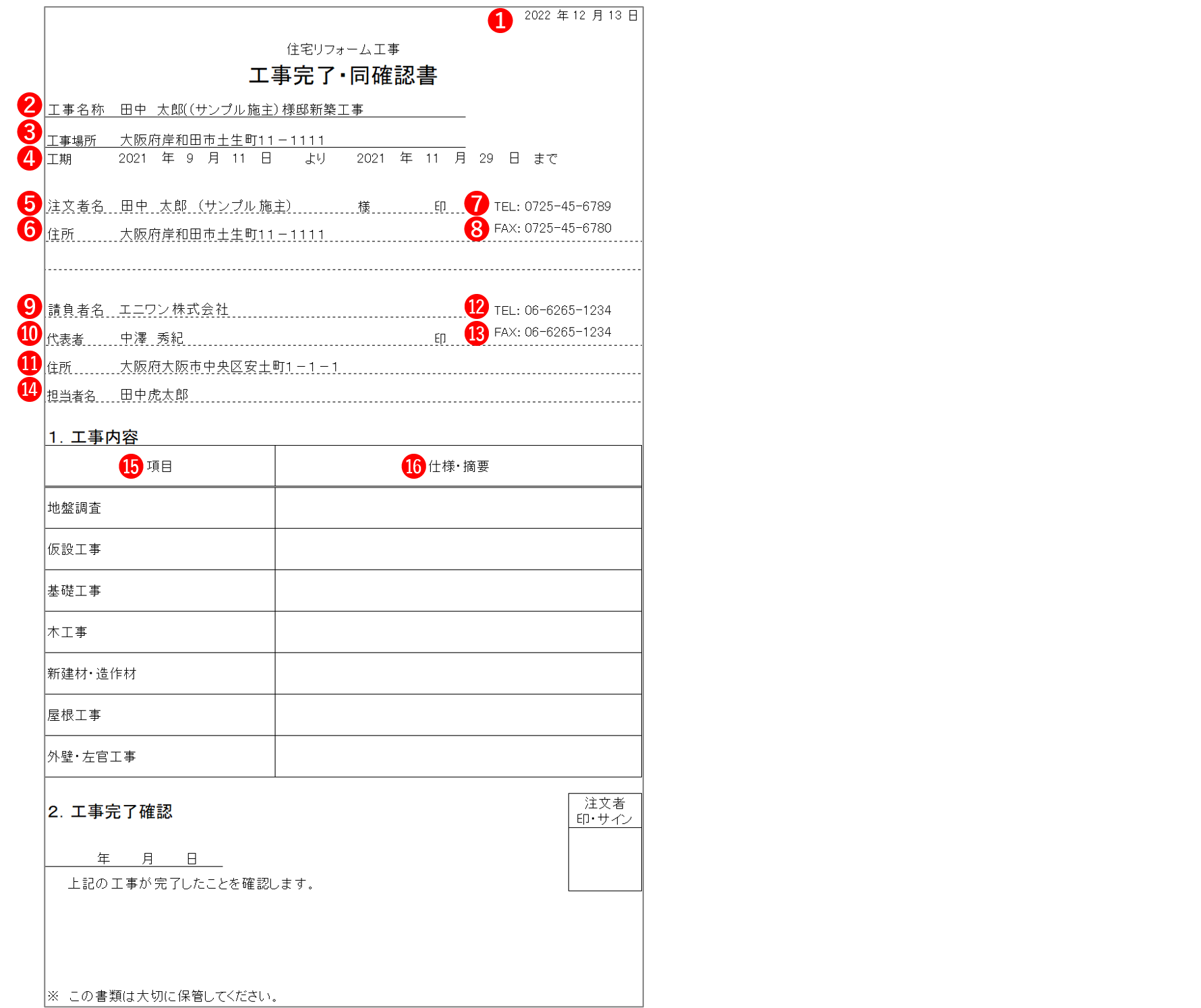 ⓮担当者名:「工事担当者」