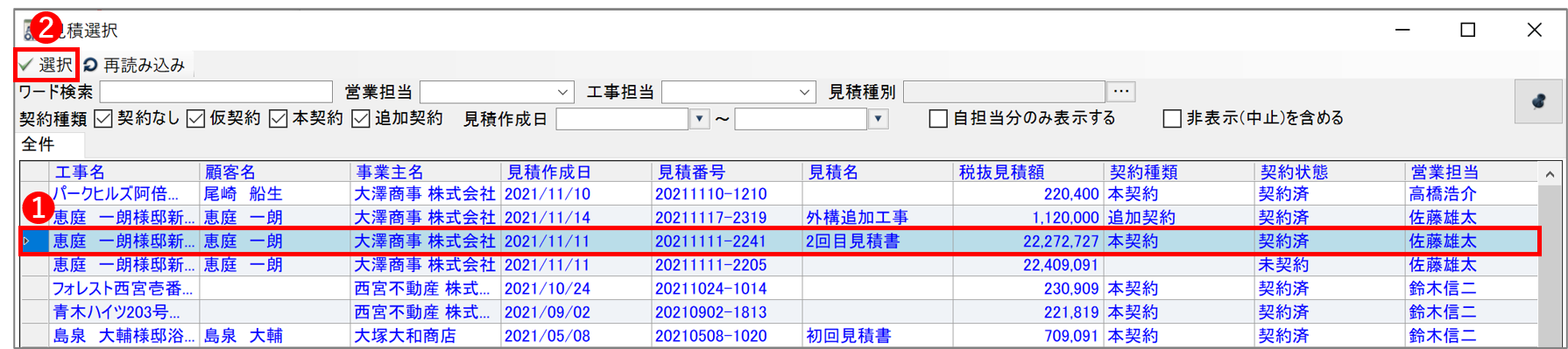 3)『見積選択』画面が表示されるので、参照する見積りを選択➊し、ツールバーの「選択」➋ボタンをクリックします。(もしくは選択したい工事のセルをダブルクリックします)