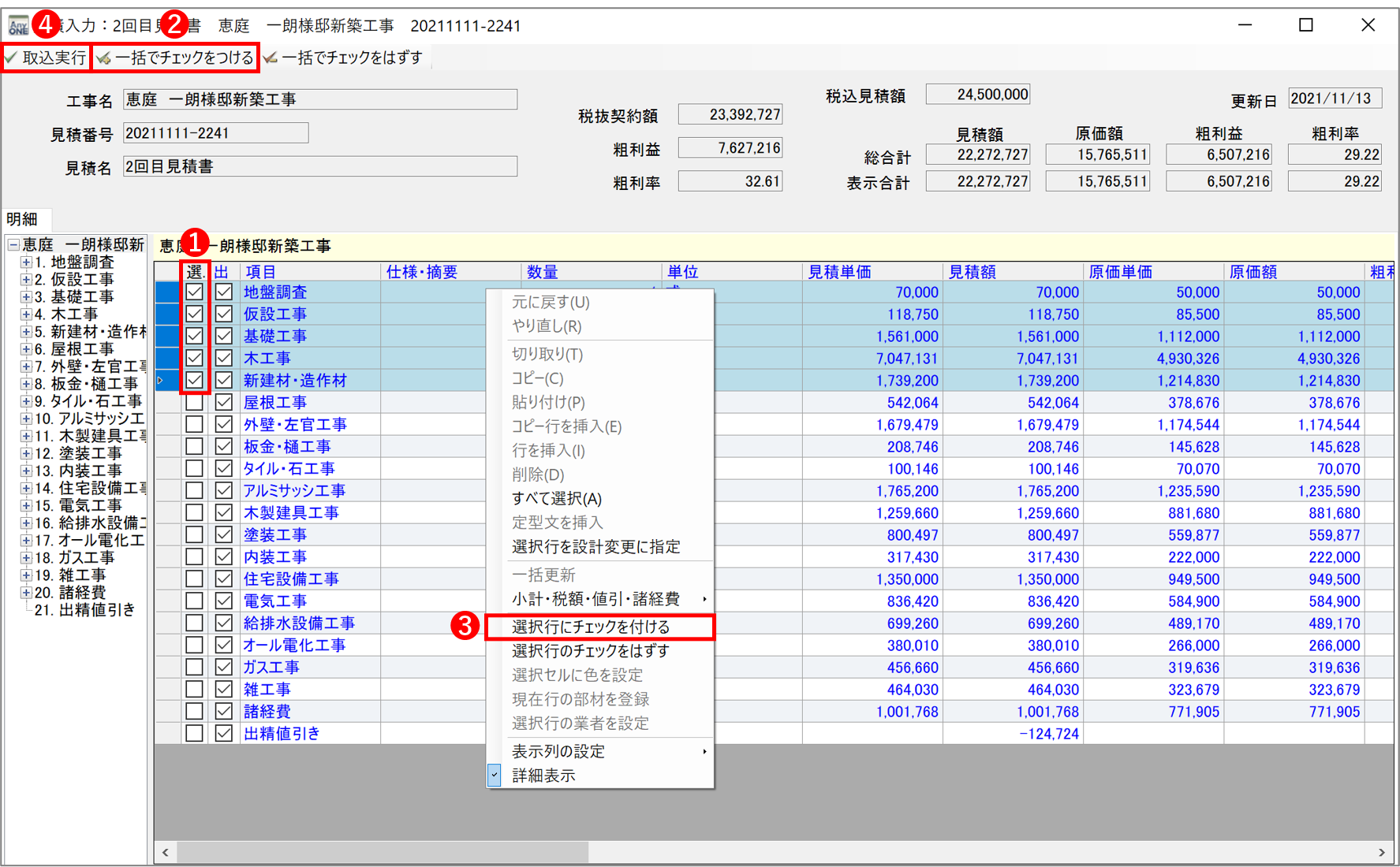 4)見積明細が表示されるので、取り込みたい明細の「選択」❶にチェックをつけていきます。