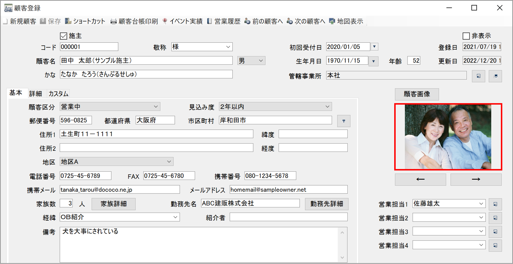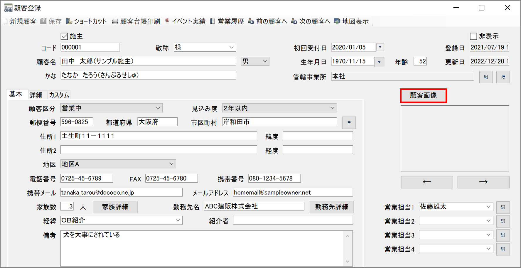 AnyONEでは、『顧客登録』画面に顧客の画像を表示ができます。画像数は一枚ではなく、複数枚登録が可能です。こちらでは顧客一覧画面から画像を登録する方法についてご説明します。