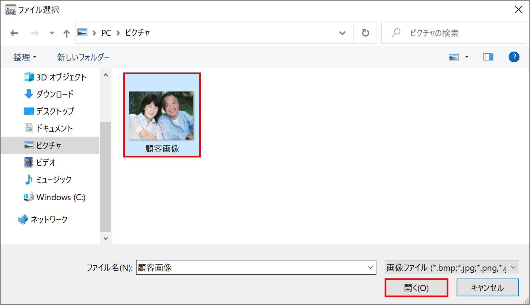 5)『ファイル選択』画面が表示されるので、登録したい顧客画像を選択し、「開く」ボタンをクリックします。
