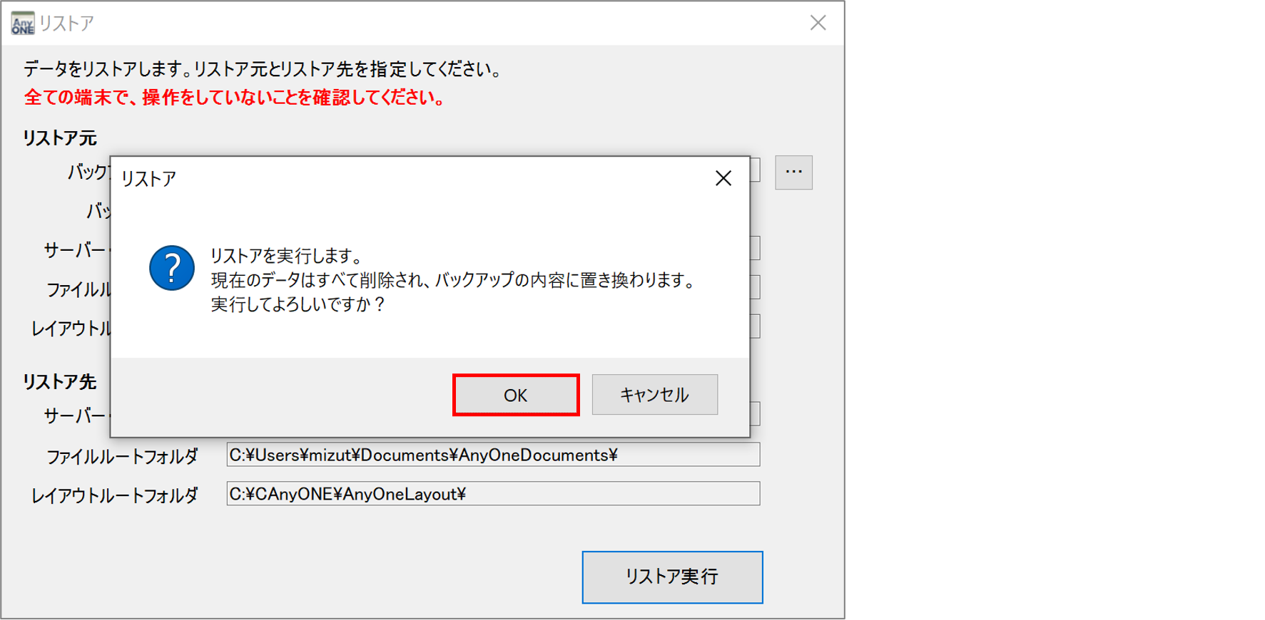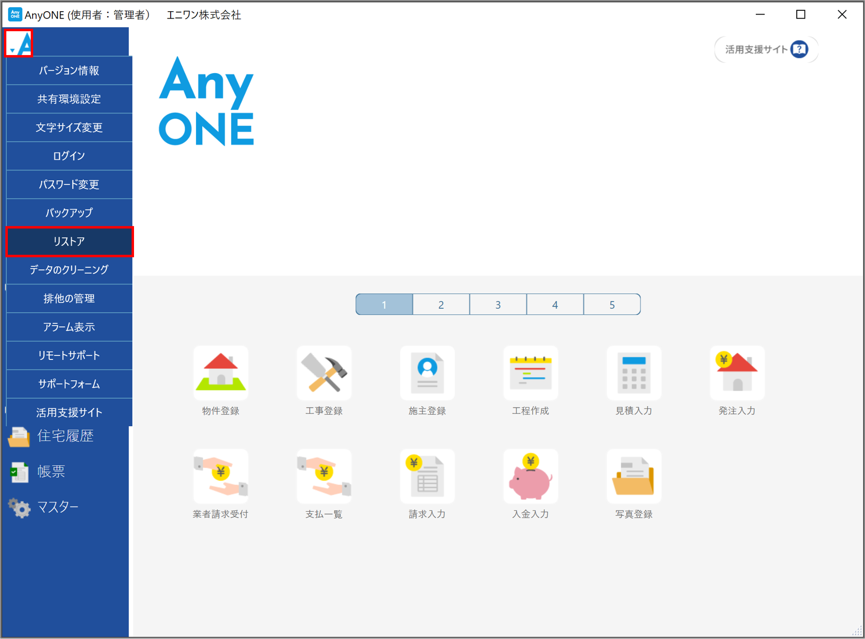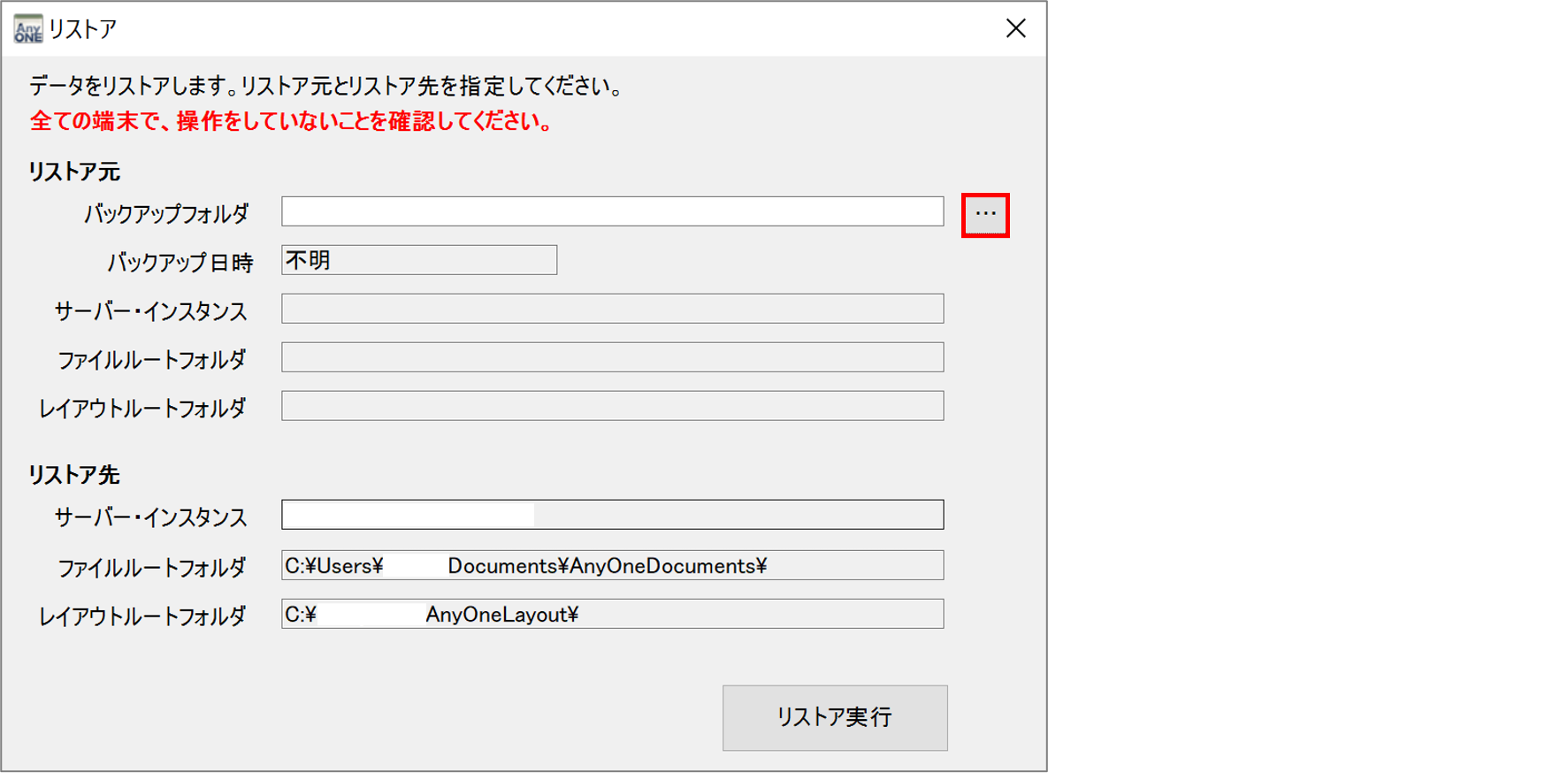 バックアップしたデータを取り込むには「リストア」(データの復元)をおこないます。リストアはバックアップしたときの状態に戻す作業です。1ヶ月前にバックアップしたデータをリストアすると、AnyONEのデータが1ヶ月前の状態に戻ります。こちらでは、事前にバックアップしたデータをリストアする方法についてご説明します。バックアップの方法は別途マニュアルをご覧ください。