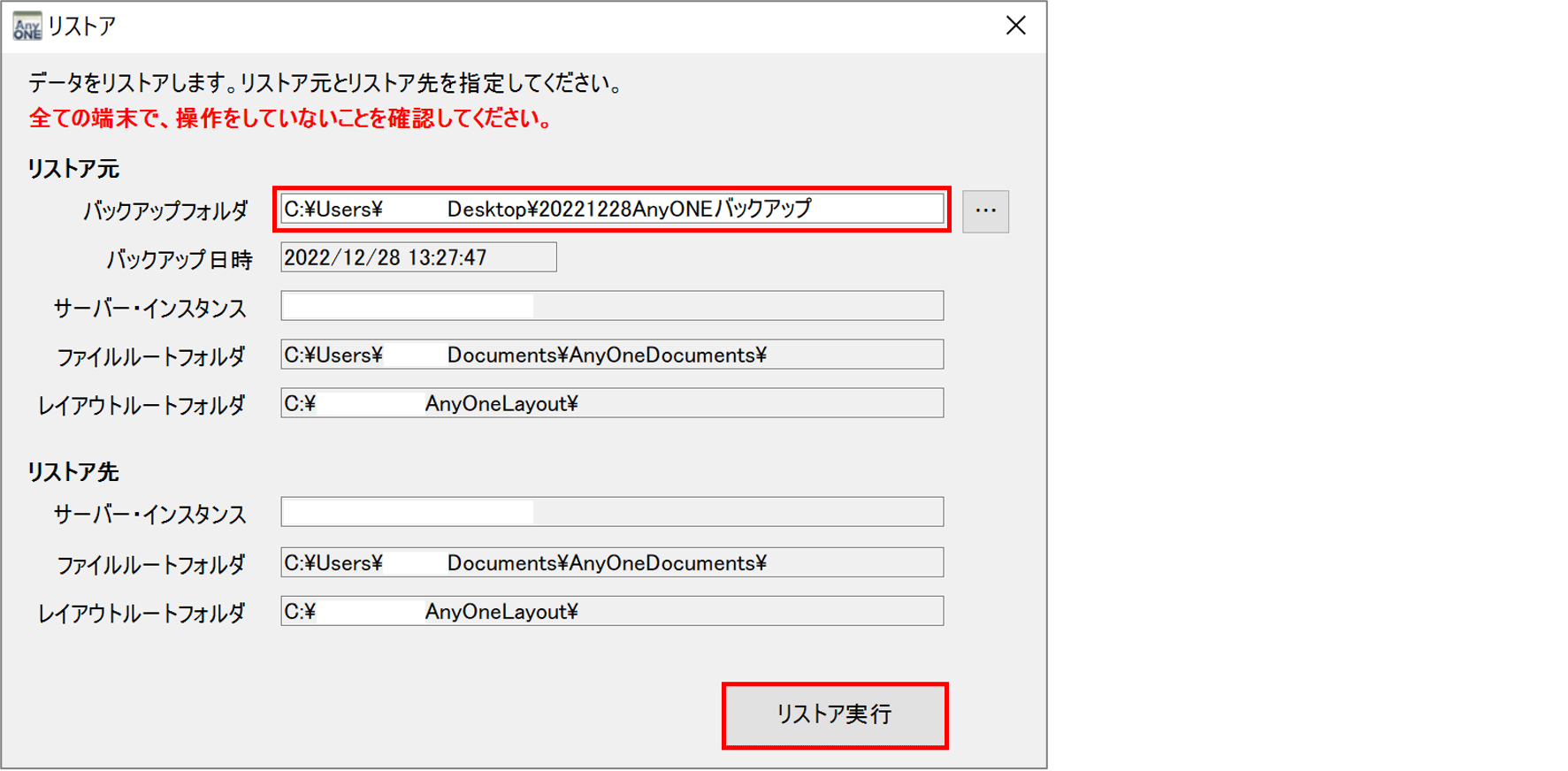 一度リストアを実行すると、リストア前のデータには戻せません。そのため、リストアの実行前に現在のデータをバックアップすることをおすすめします。バックアップの際は、以前保存したバックアップデータに上書きしないように、必ず別のフォルダを作成して保存してください。