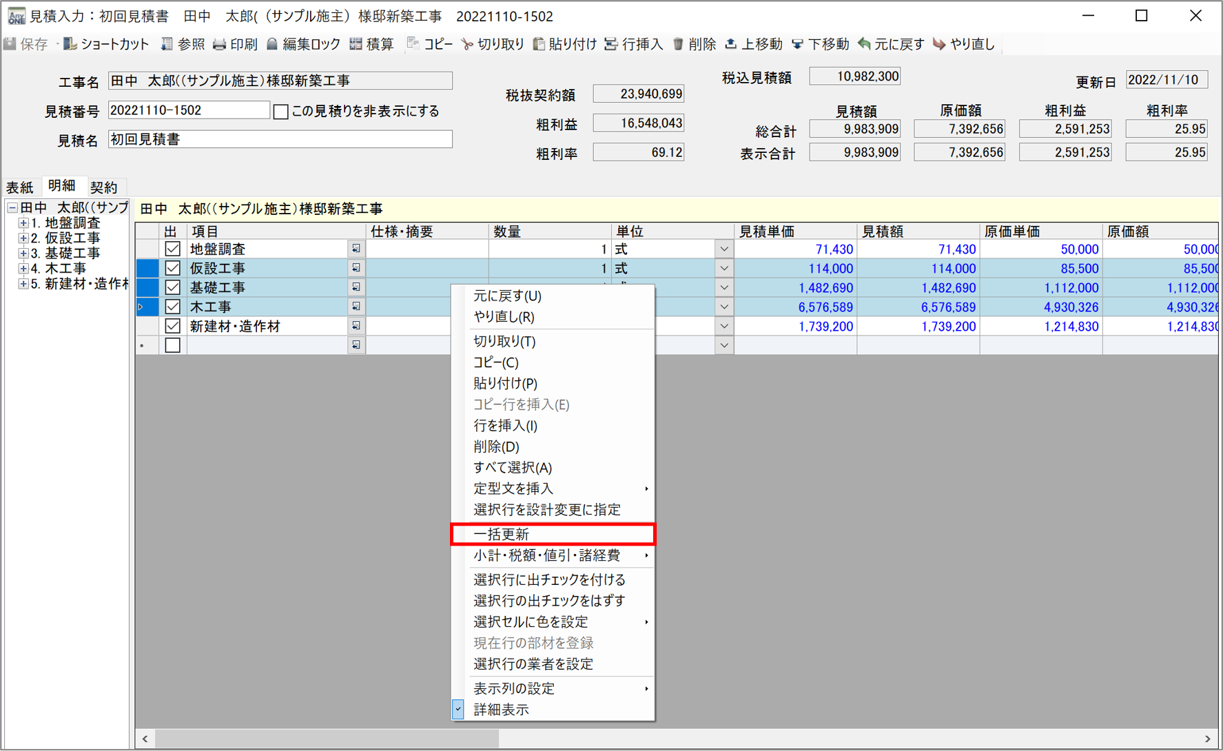 1)『見積入力』画面で更新したい行を選択して、右クリックの「一括更新」をクリックします。