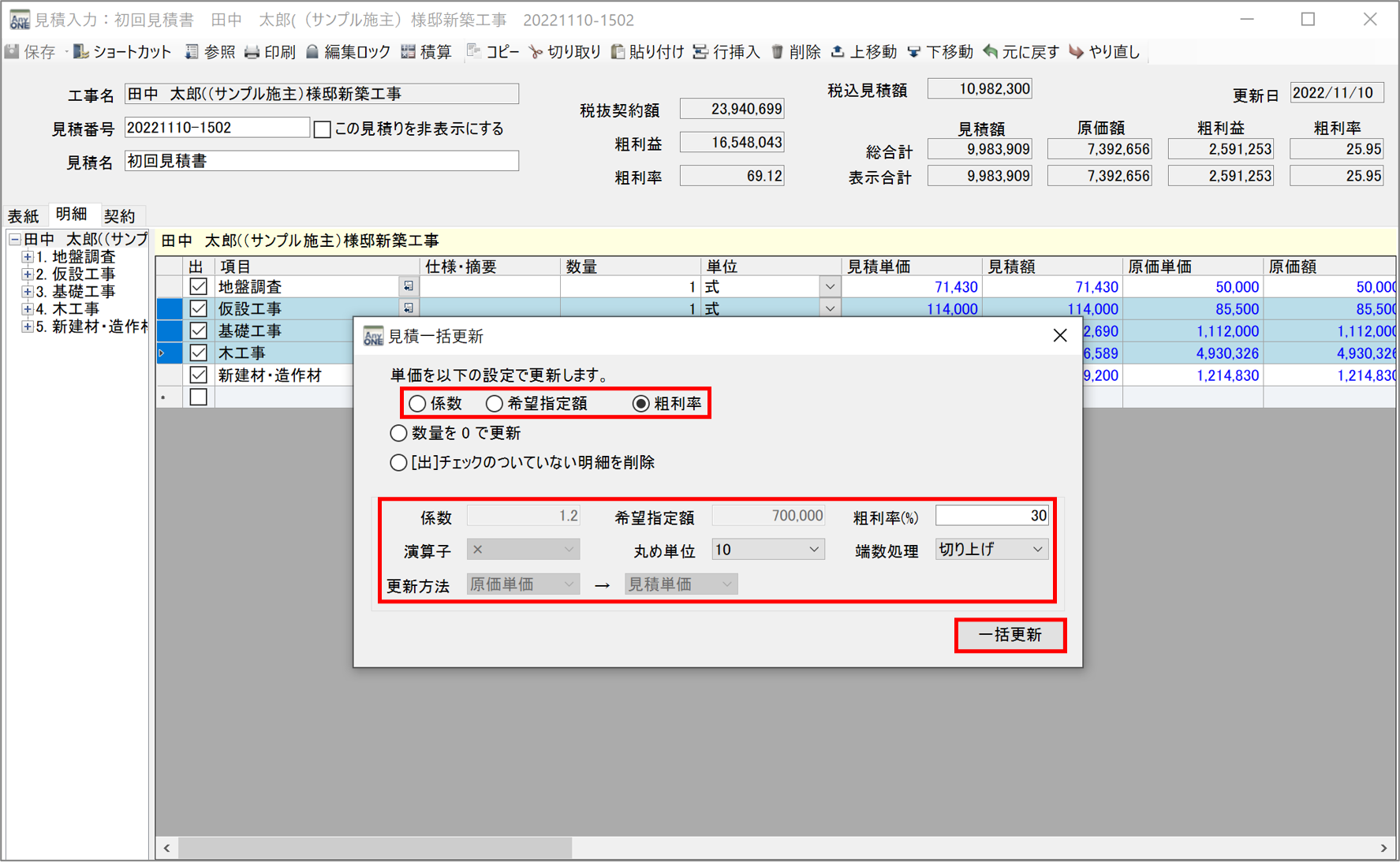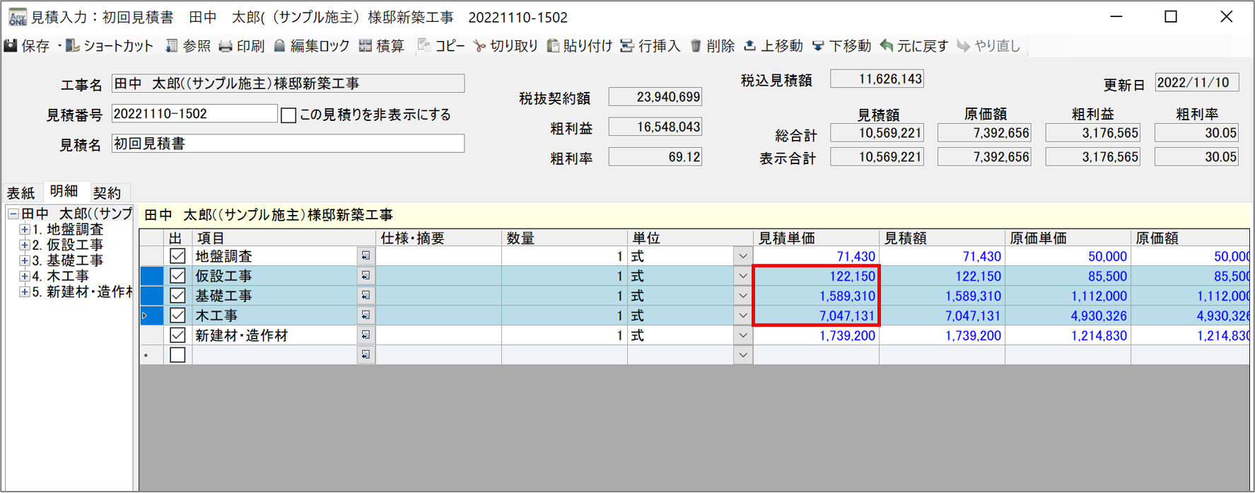 選択行が指定した粗利率になるように見積単価を自動設定します。