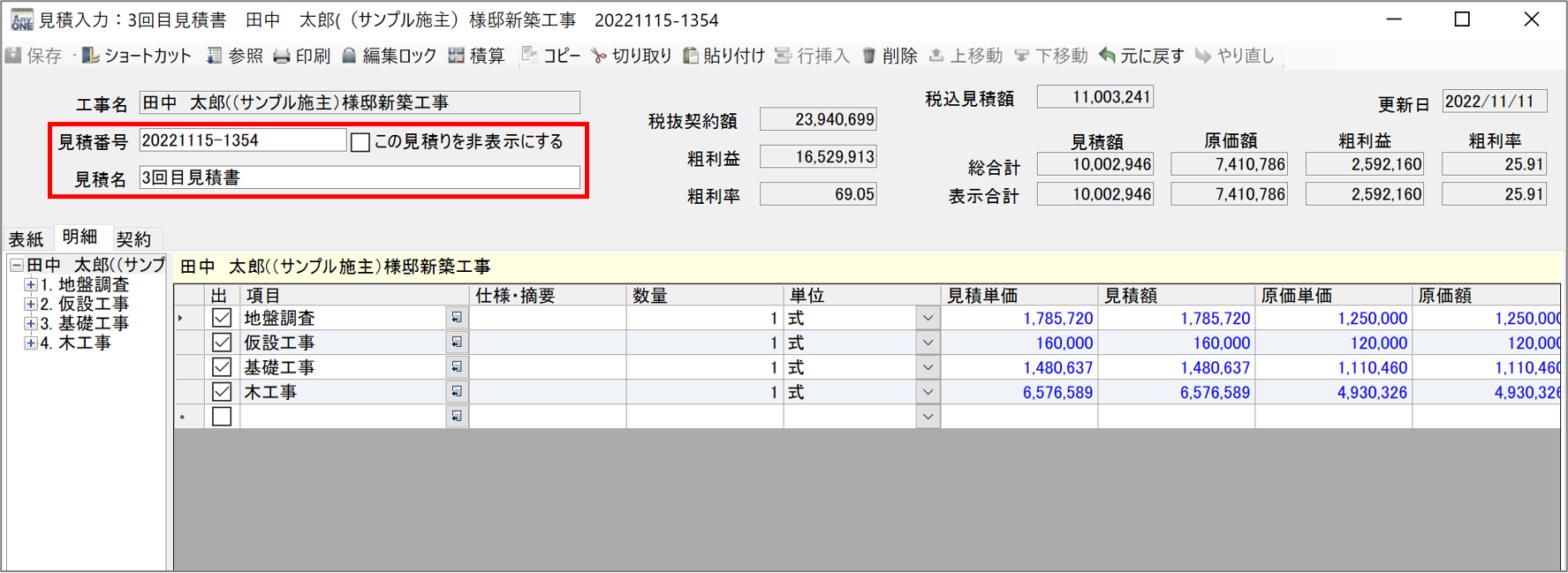 3)複製された見積の『見積入力』画面が表示されます。内容は複製元と全く同じなので、修正後に保存して閉じます。