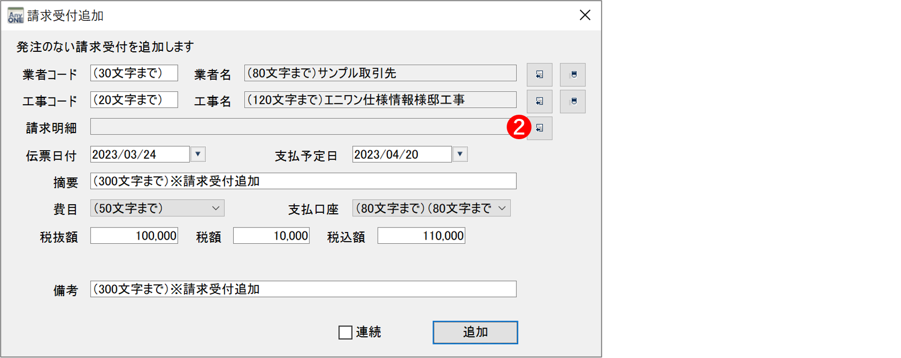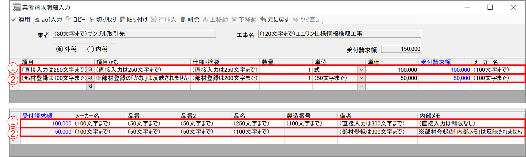 こちらのマニュアルでは、各画像上にて『業者請求受付』画面で入力できる文字数を掲載しています。各画像はクリックすると拡大表示されますので、拡大表示してご覧ください。マスター設定が必要な項目については、各マスターのマニュアルをご覧ください。