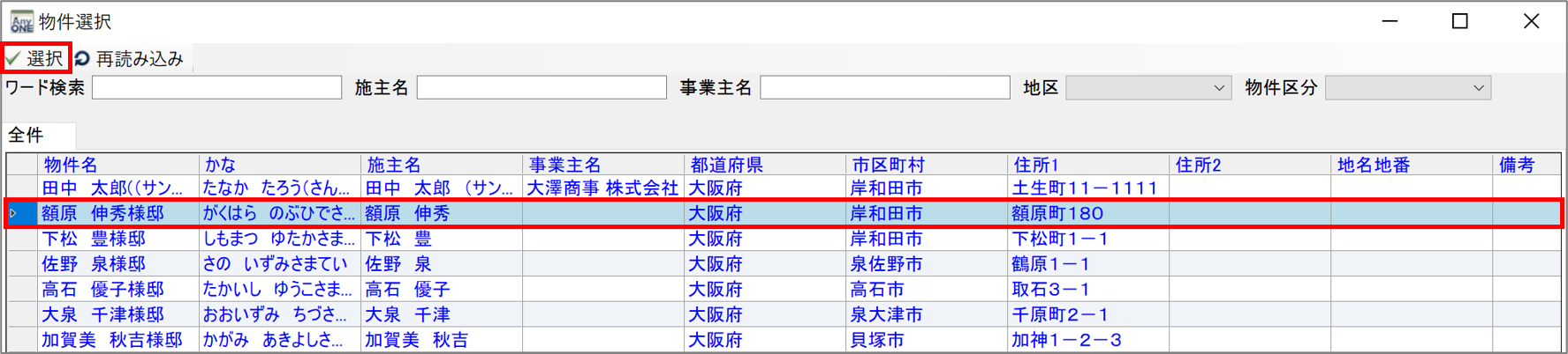 11)『物件選択』画面が表示されるので、物件を選択し、ツールバーの「選択」ボタンをクリックします。