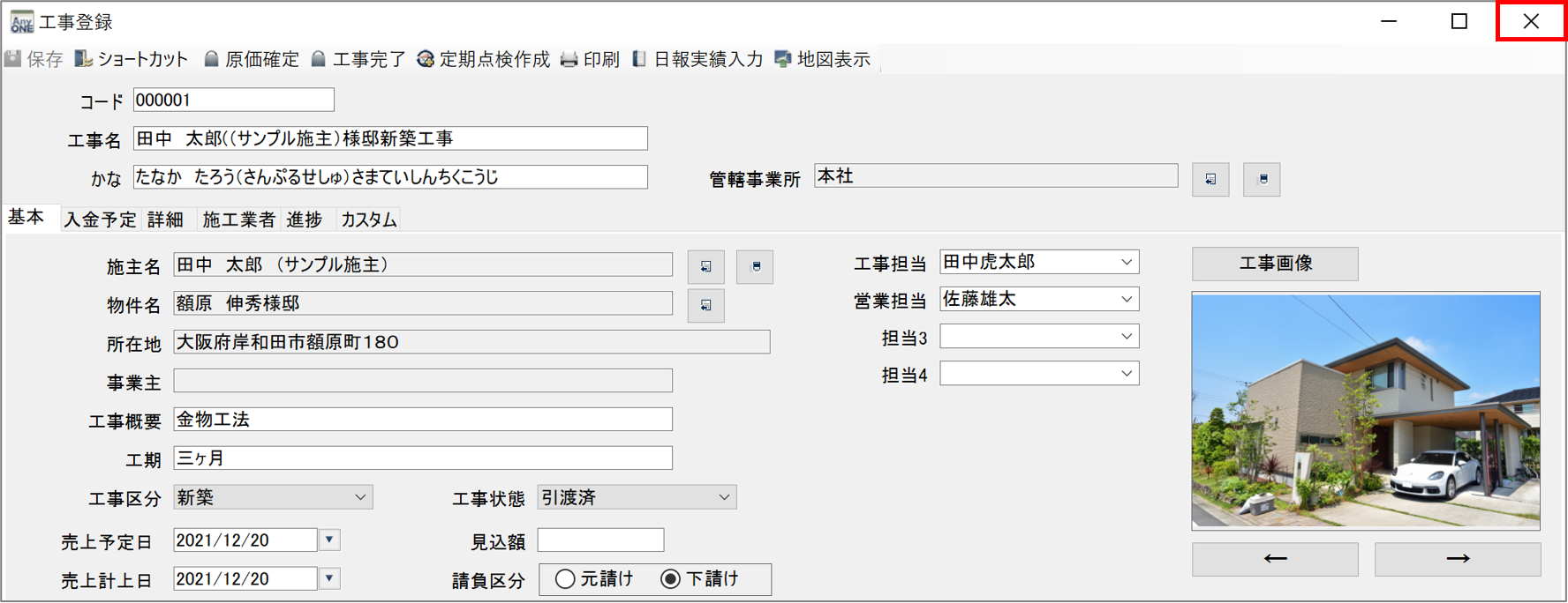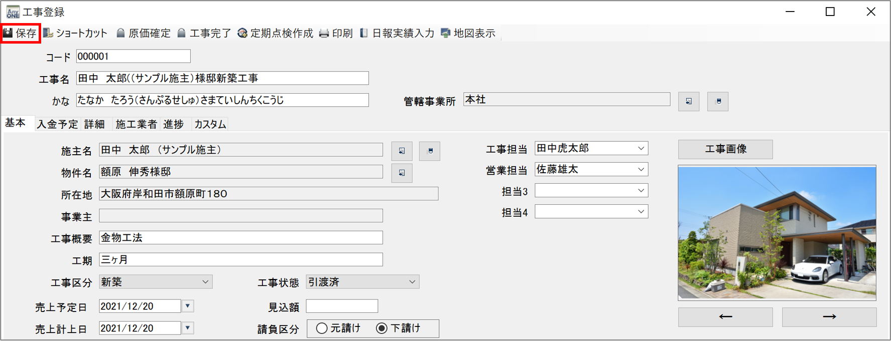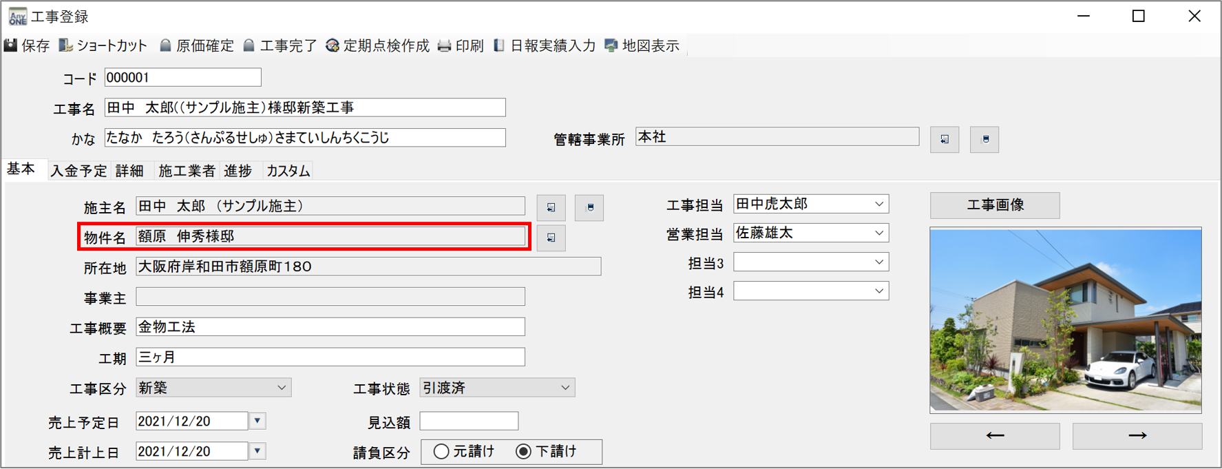 12)『工事登録』画面に戻ります。「物件名」に選択した物件名が表示されていることを確認します。