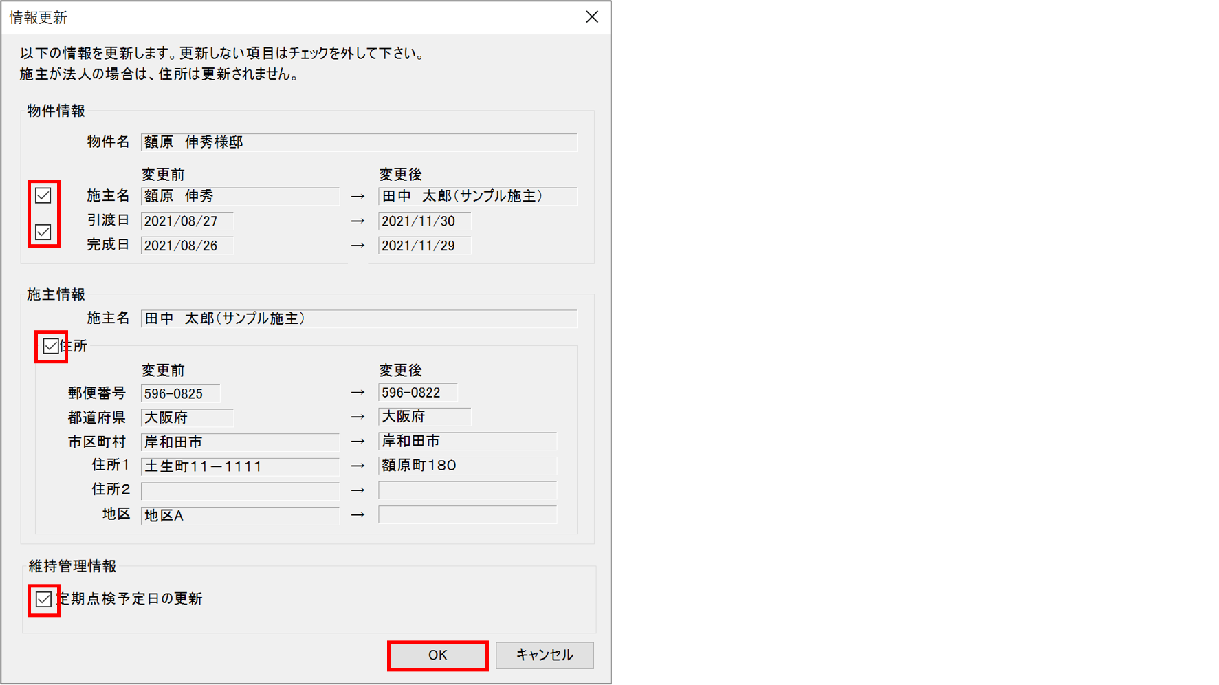 14)『情報更新』画面が表示されるので、情報を更新する項目にチェックをつけて「OK」ボタンをクリックします。