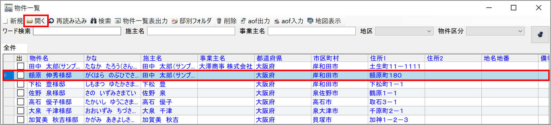 17)『物件一覧』画面が表示されるので、11)で選択した物件を選択して、ツールバーの「開く」ボタンをクリックします。