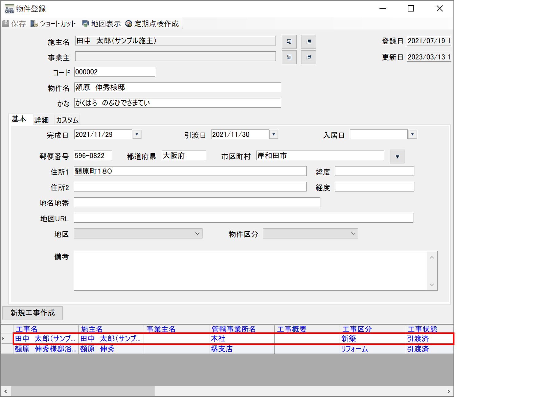 同じ物件を2つ作成していた場合で、紐付けから外した物件を削除する時は場合は、必ず他に工事が紐付けされていないかを確認した後に削除してください。